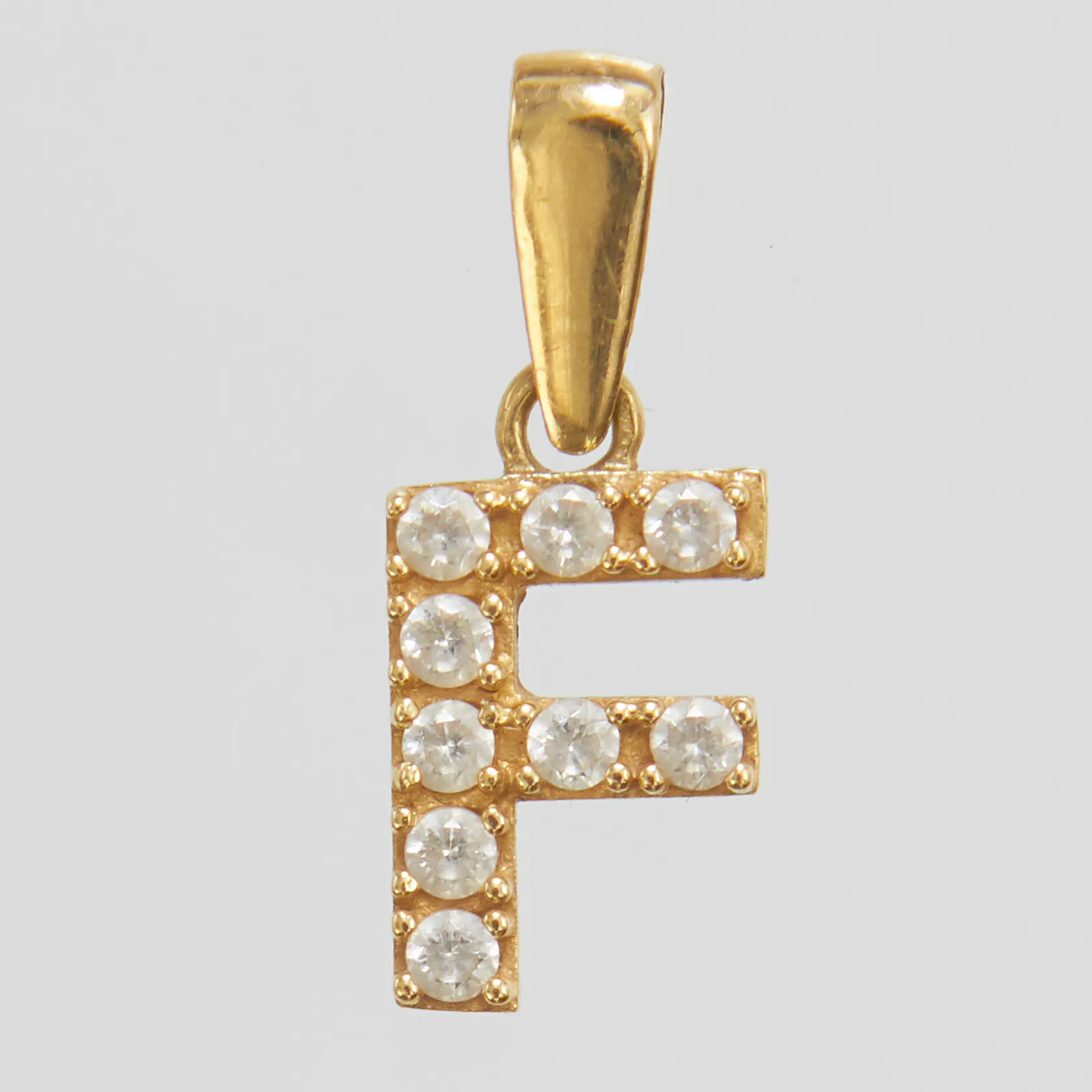 Hänge, bokstaven F med vita stenar, 15,7-6,2mm, GHA, klämd ögla, 18K Vikt: 0,4 g.
