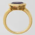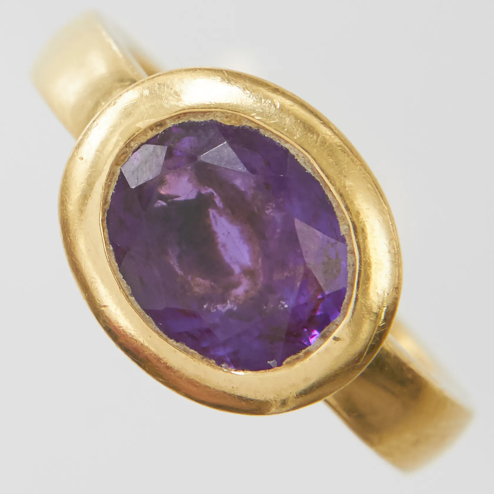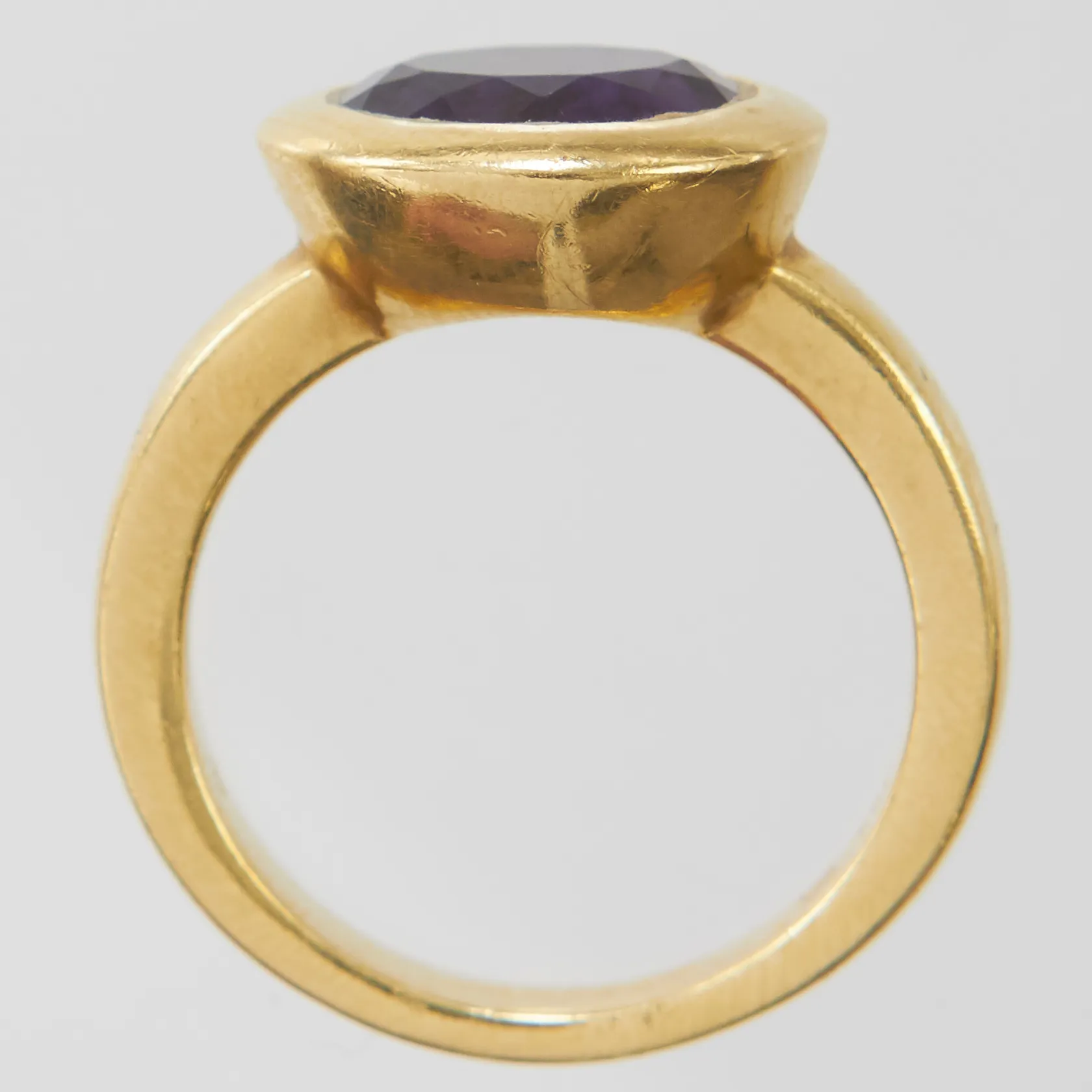 Ring med en oval ametist ca 10x8mm, stl18¼, bredd 3,6-12mm, 18K Vikt: 9,3 g.