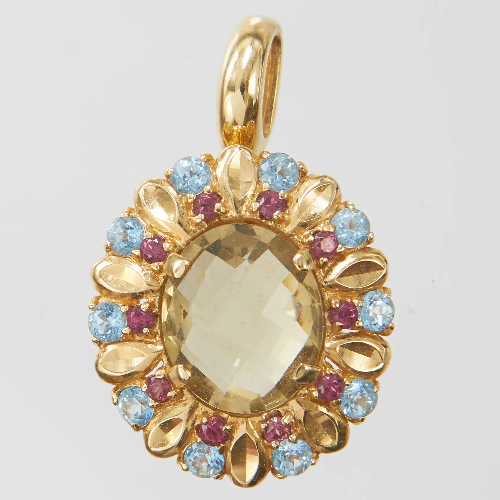 Hänge med grön kvarts samt stenar, längd ca 30mm inkl ögla, bredd 19mm, 14K, bruttovikt: 6,0g. Vikt: 6 g.