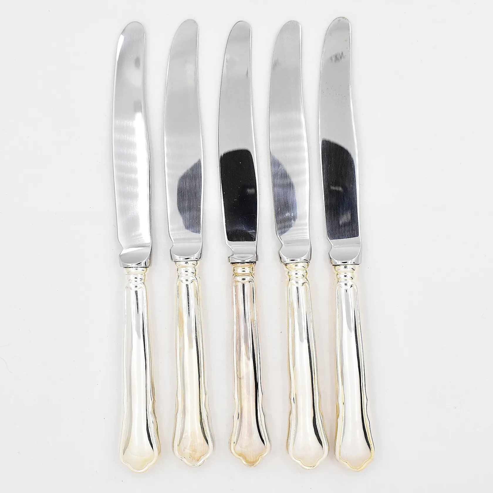 Fem knivar modell Chippendale, ca 20,5cm, blad i rostfritt stål, fyllda skaft, 830/1000 Silver, bruttovikt 372,6 gram Vikt: 372,6 g.