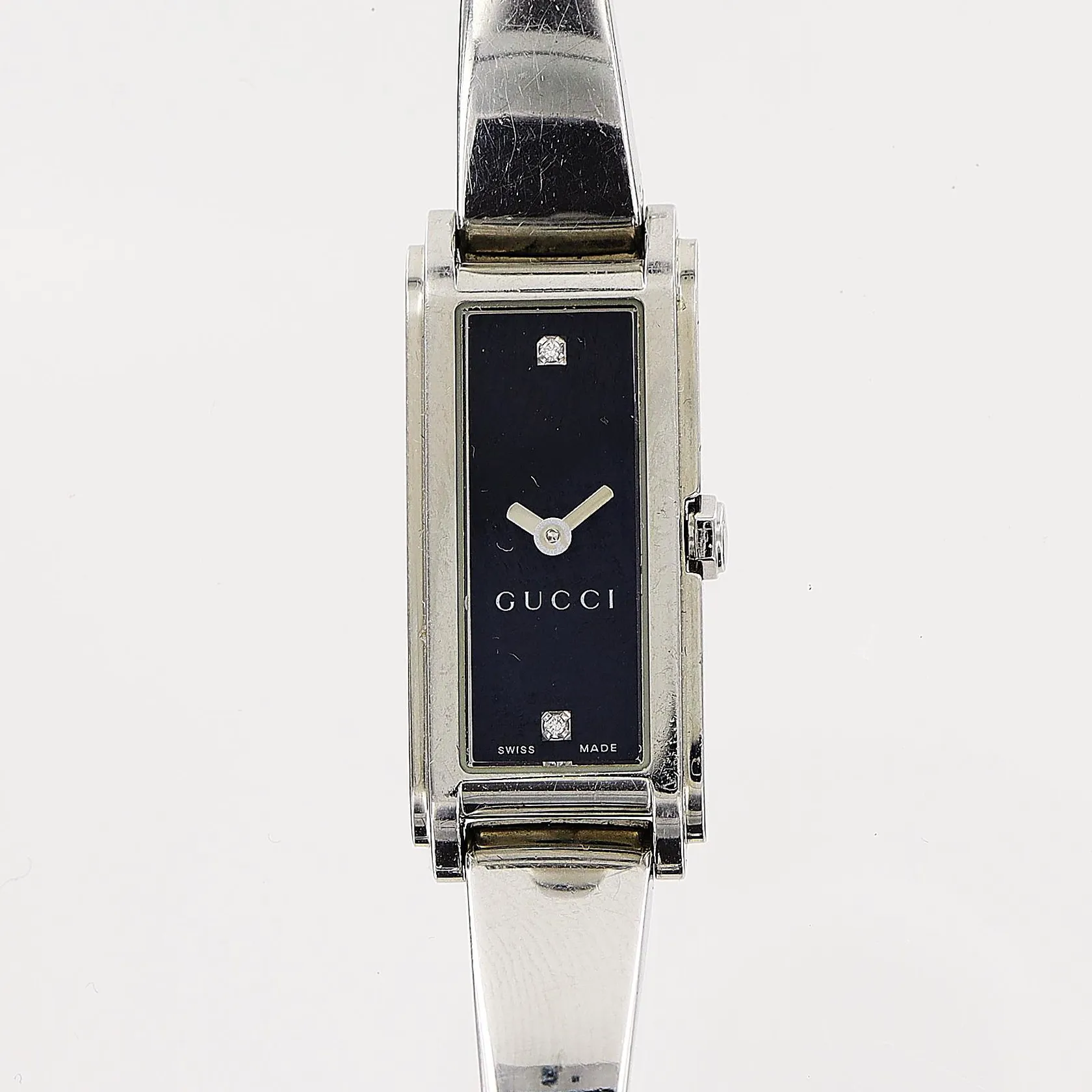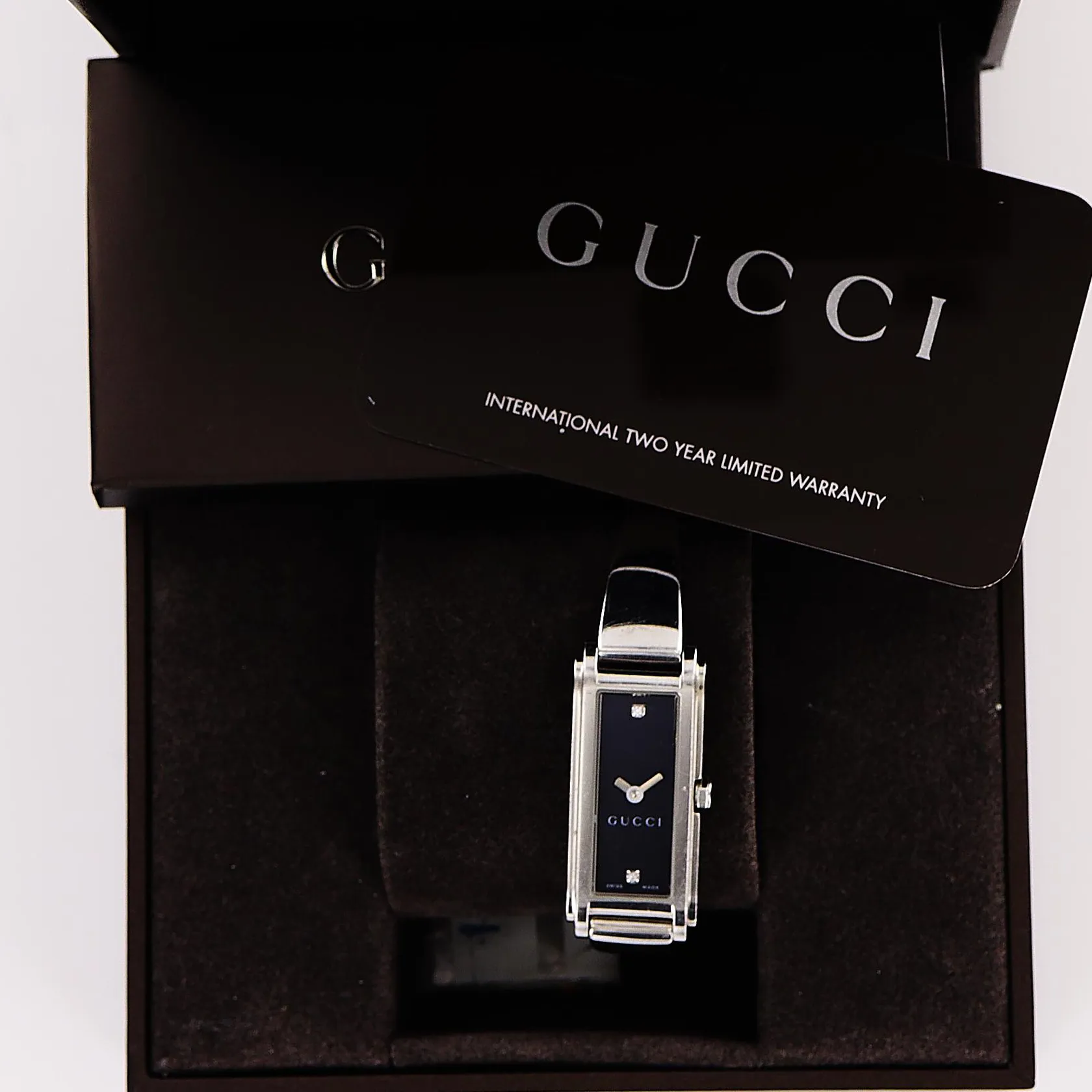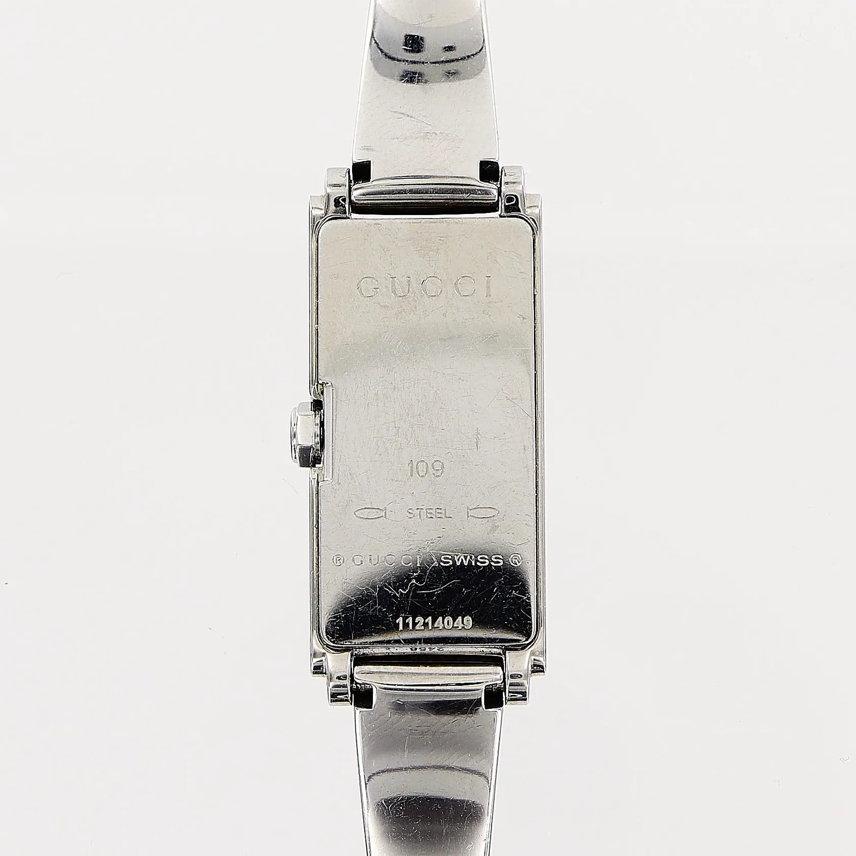 Damur Gucci, stål, quartz, 25x14mm, svart urtavla, modell 109, serienr 11214049, stel länk 14cm, i behov av batteribyte, bruksmärken, bok, box.