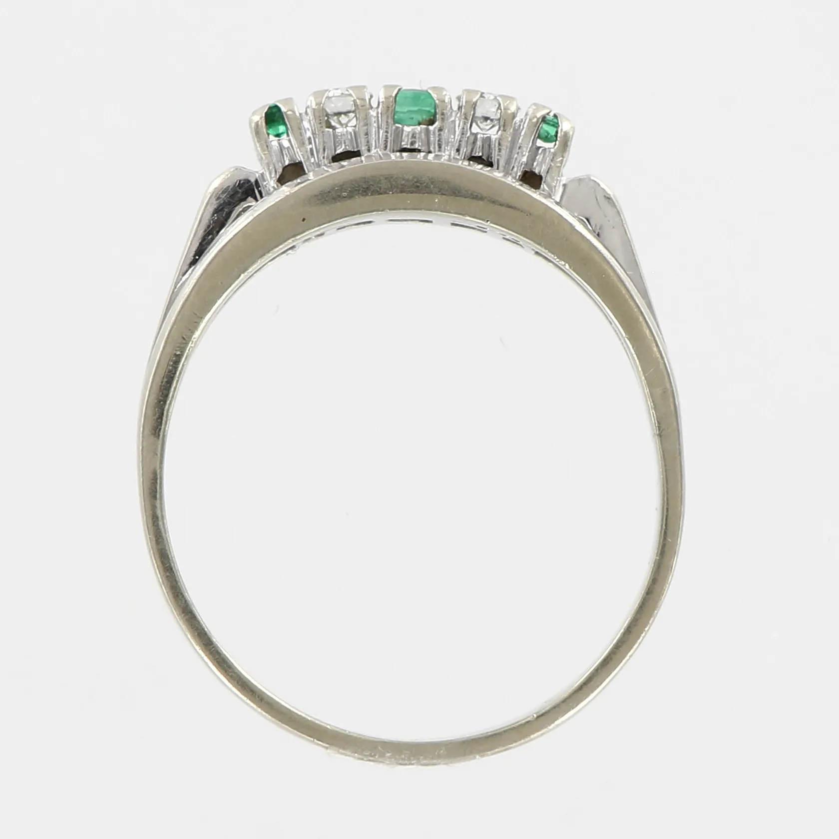 Ring med smaragder & diamanter 2x0,05ct, stl 17½, bredd 5,5mm, vitguld, i behov av rodiering, 18K. Finns för visning på Pantbanken Skärholmen Vikt: 4,1 g.