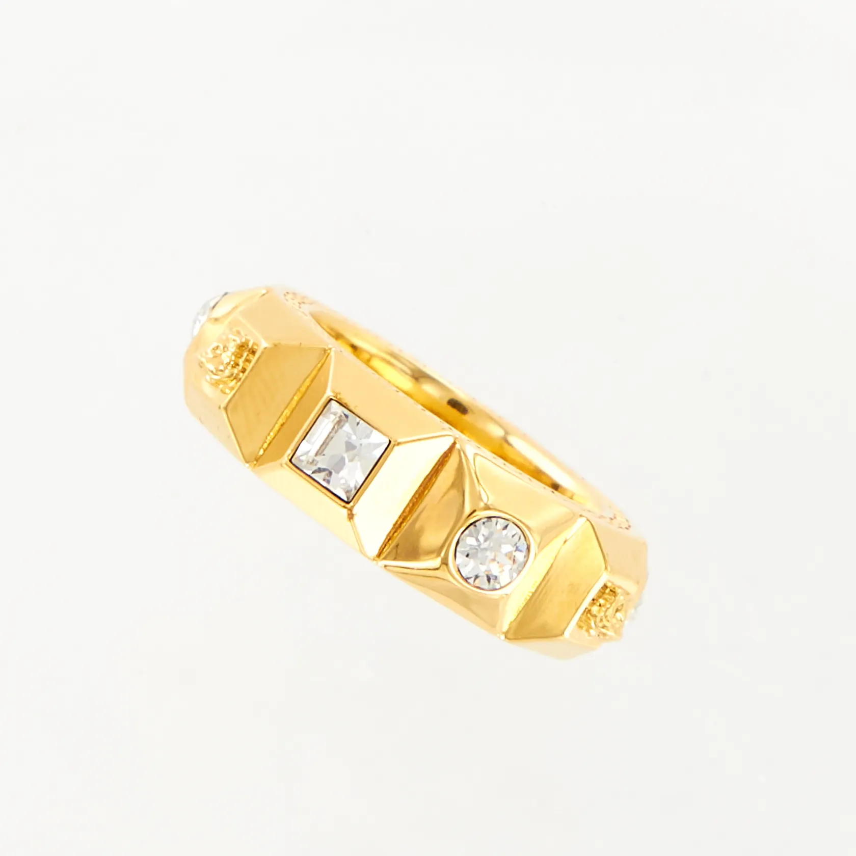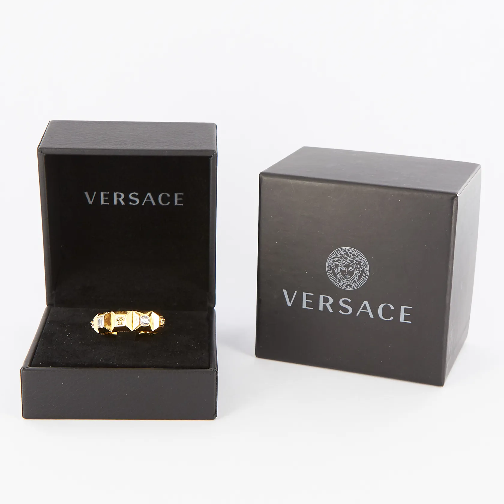 Ring Versace med vita stenar, stl: ca 19¼, bredd: 8,2mm, guldfärgad metall, originaletui samt ytterkartong Finns för visning på Pantbanken Skärholmen