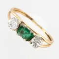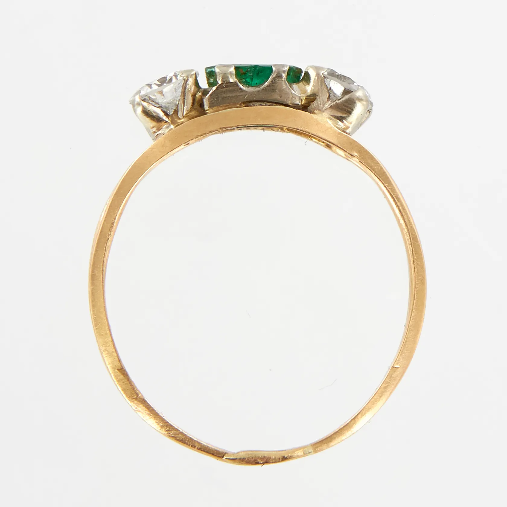 STEN SAKNAS! Ring med smaragd och diamanter 2x0,23ct, smaragd ca 3,1x6,2mm, stl 16½, bredd framtill ca 4mm, skev, slitna klor, nagg och inneslutningar i smaragd, 18K. Finns för visning på Pantbanken Skärholmen Vikt: 1,8 g.