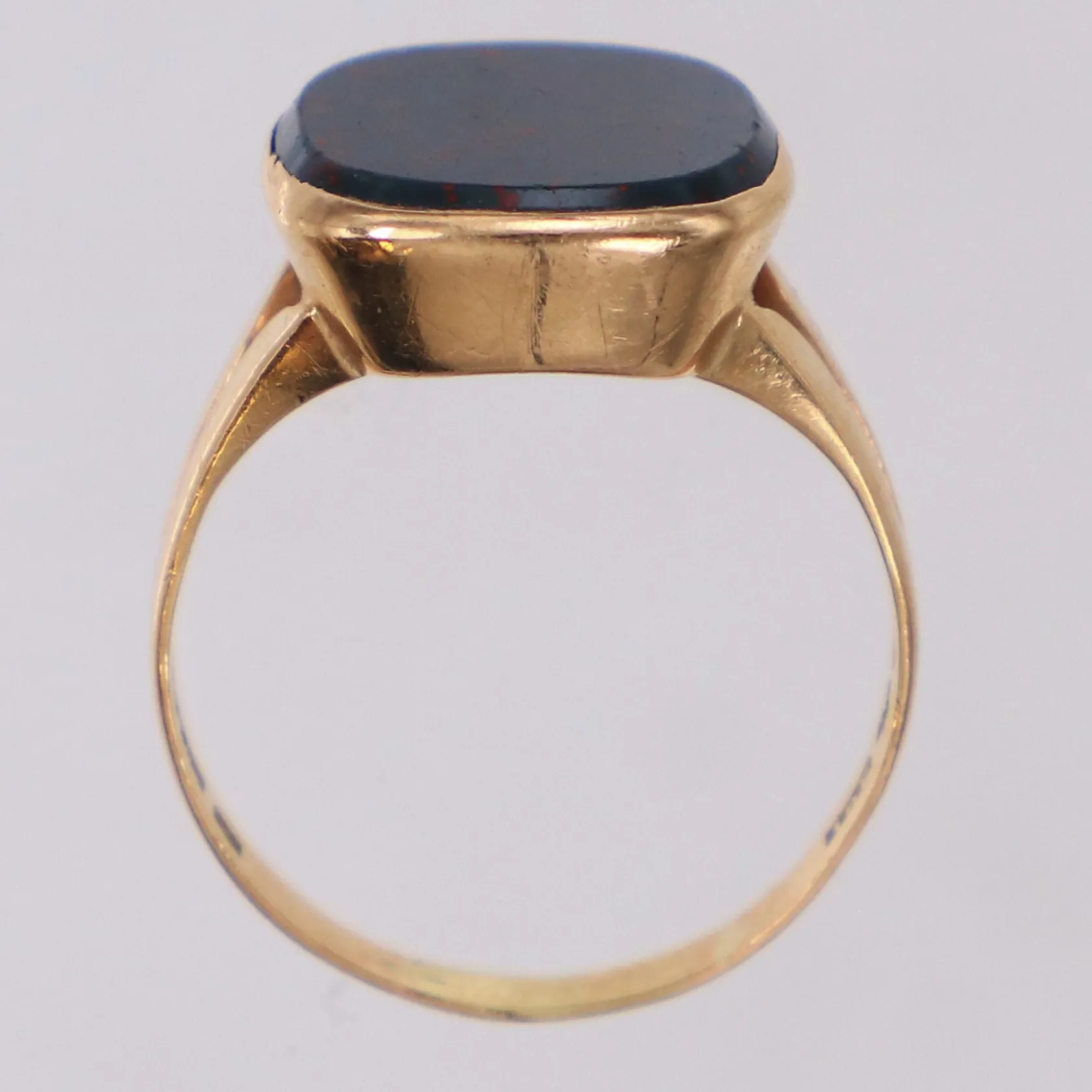 Klackring med heliotrop, stl 16½, bredd 2,3-13,3mm, Guldvaruaktiebolaget G. Dahlgren & Co Ab, smärre repor på sten, 18K Vikt: 3,7 g.