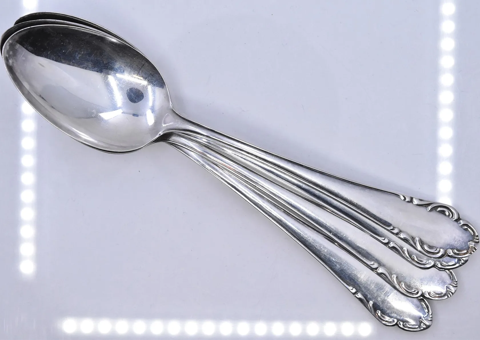4 skedar, modell Haga, längd 21,5 cm, silver 830/1000. Vikt: 234,9 g.