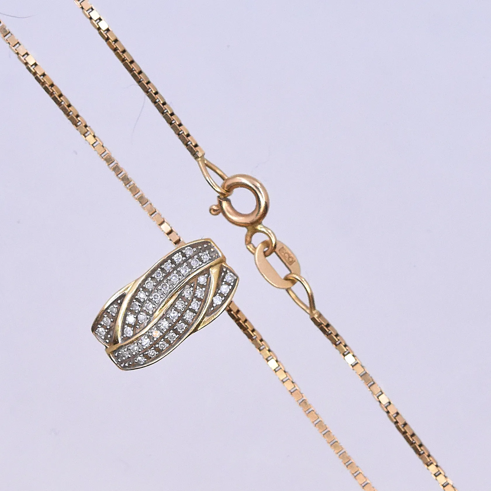 Kedja Venezia med hängd, längd på kedja 42 cm och bredd 1 mm, längd på hänge 15 mm och bredd 8 mm, 18K. Vikt: 5,2 g.