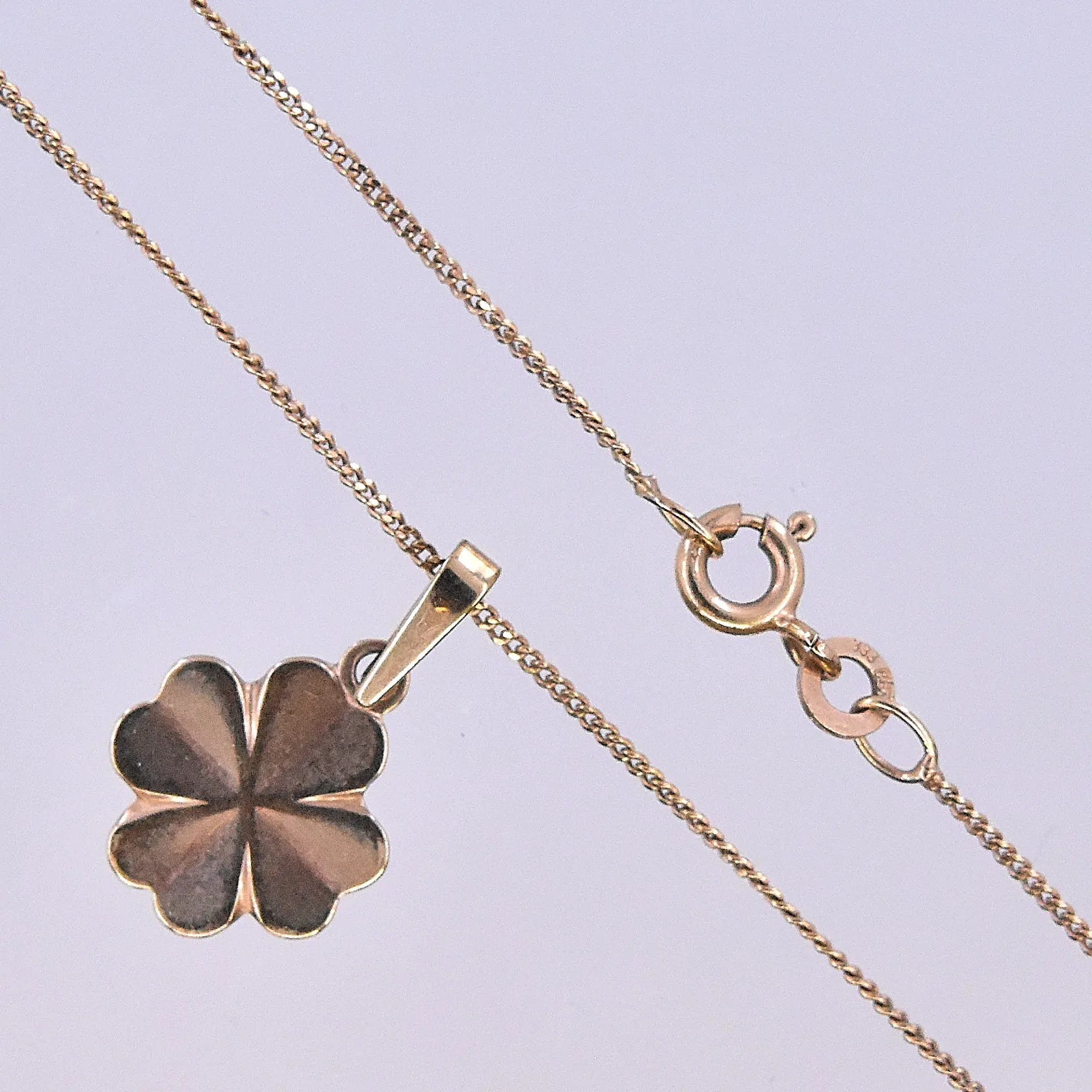 Kedja Pansar med hänge Fyrklöver, längd på kedja 44 cm och bred 1 mm, längd på hänge 19 mm och bredd 12 mm, 8K. Vikt: 2 g.
