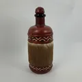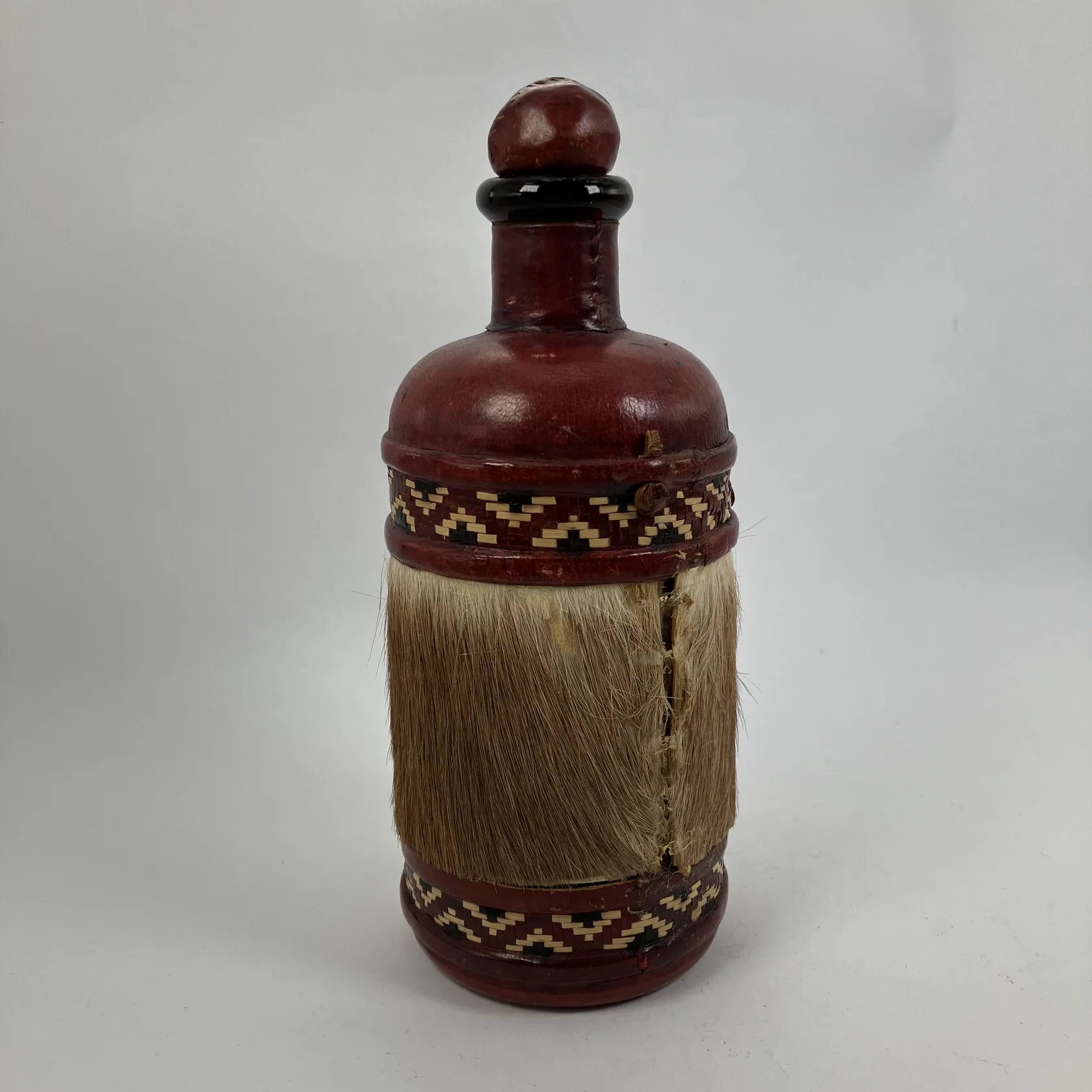 Glasflaska med läderarbete, höjd ca 21cm, rem till kork saknas, troligen Västafrika, limrester, åldersbetingat skick. Skickas med paket..