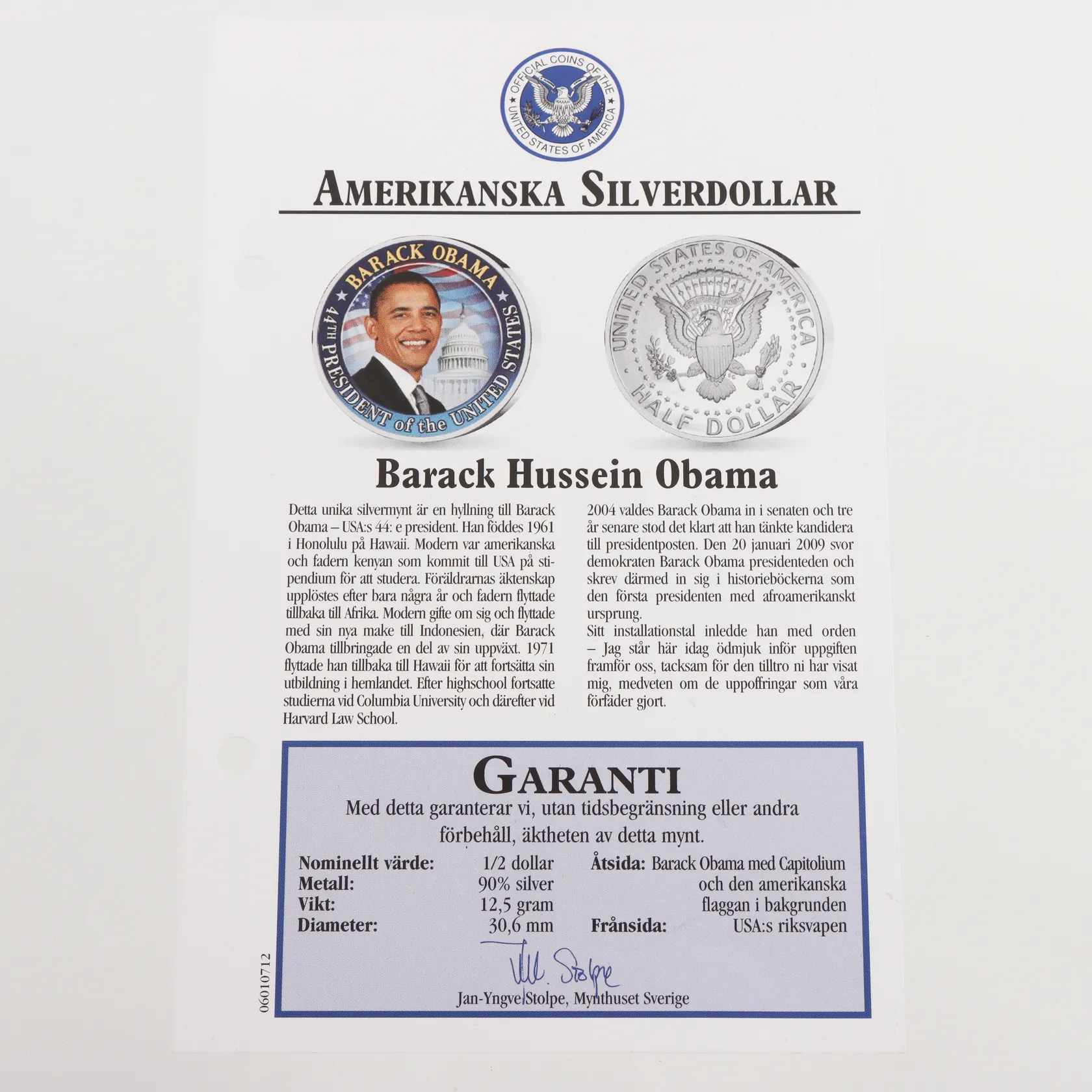 Mynt, Amerikansk silverdollar, ½ Dollar, Barack Obama, Ø30,6mm, 900/1000 silver, certifikat från Mynthuset Sverige. Vikt: 12,5 g.