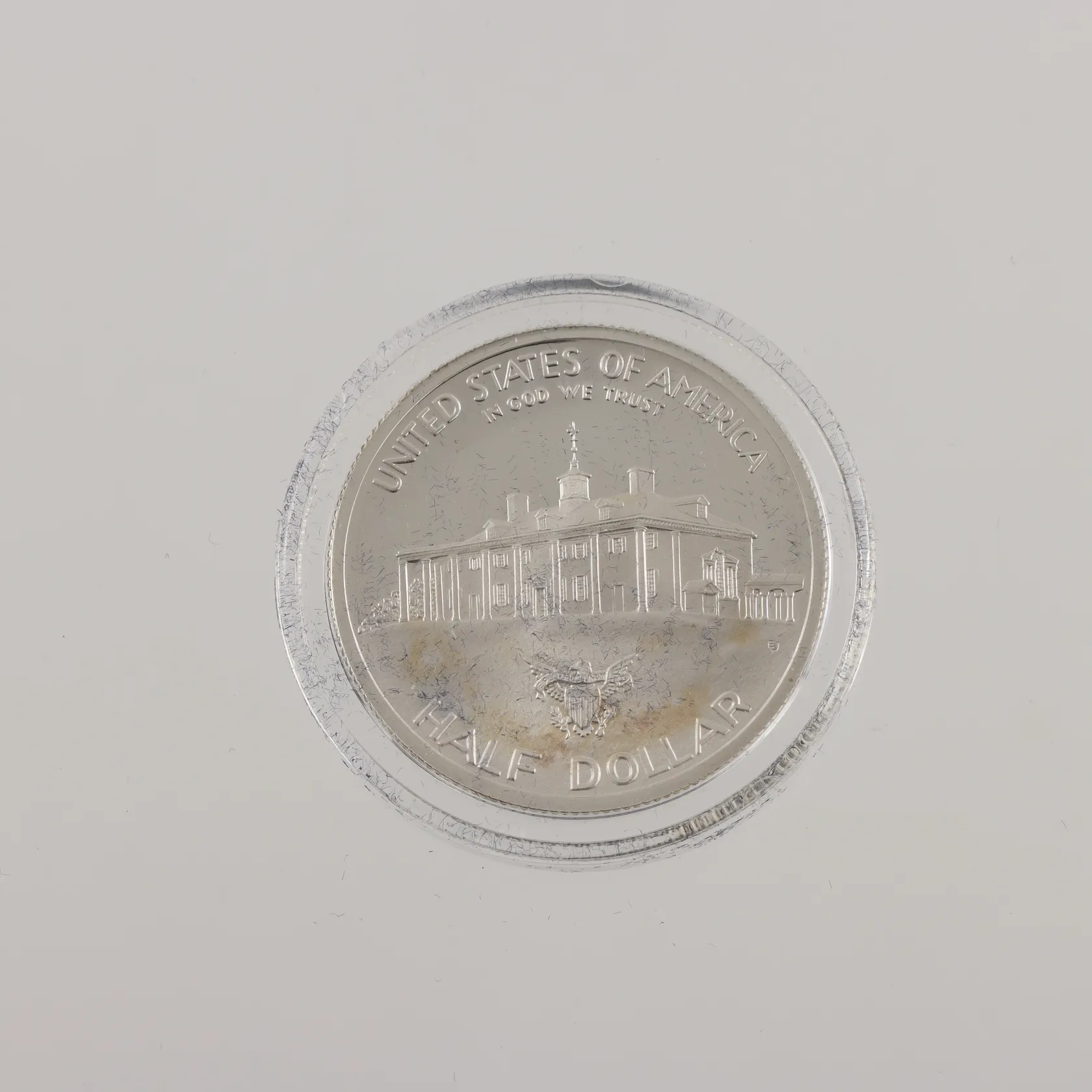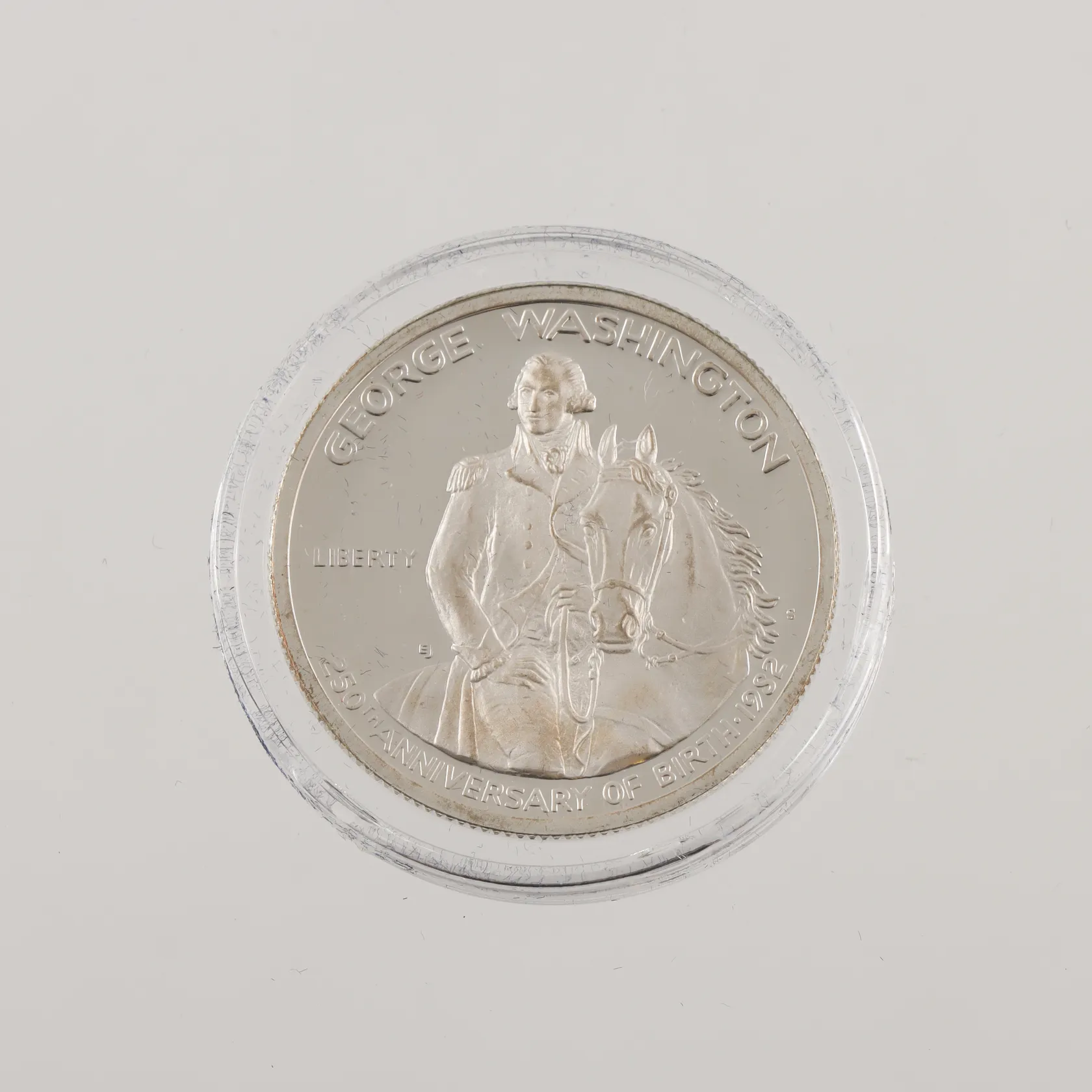 Mynt, Amerikansk silverdollar, ½ Dollar, George Washington 250år, Ø30,6mm, 900/1000 silver, plastetui, certifikat från Mynthuset Sverige. Vikt: 12,5 g.