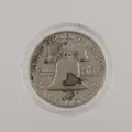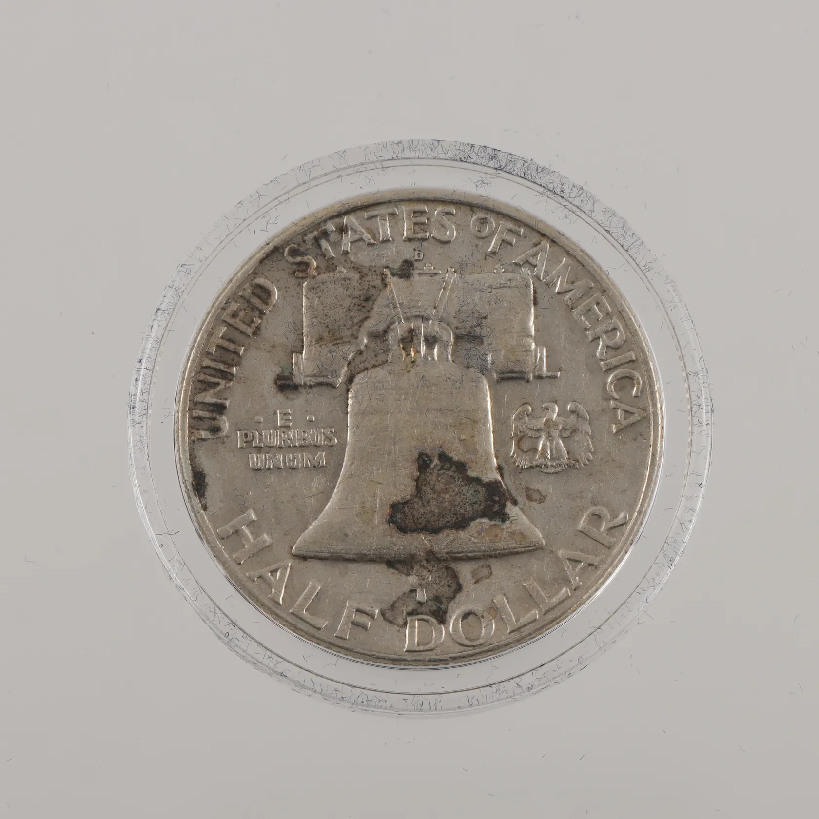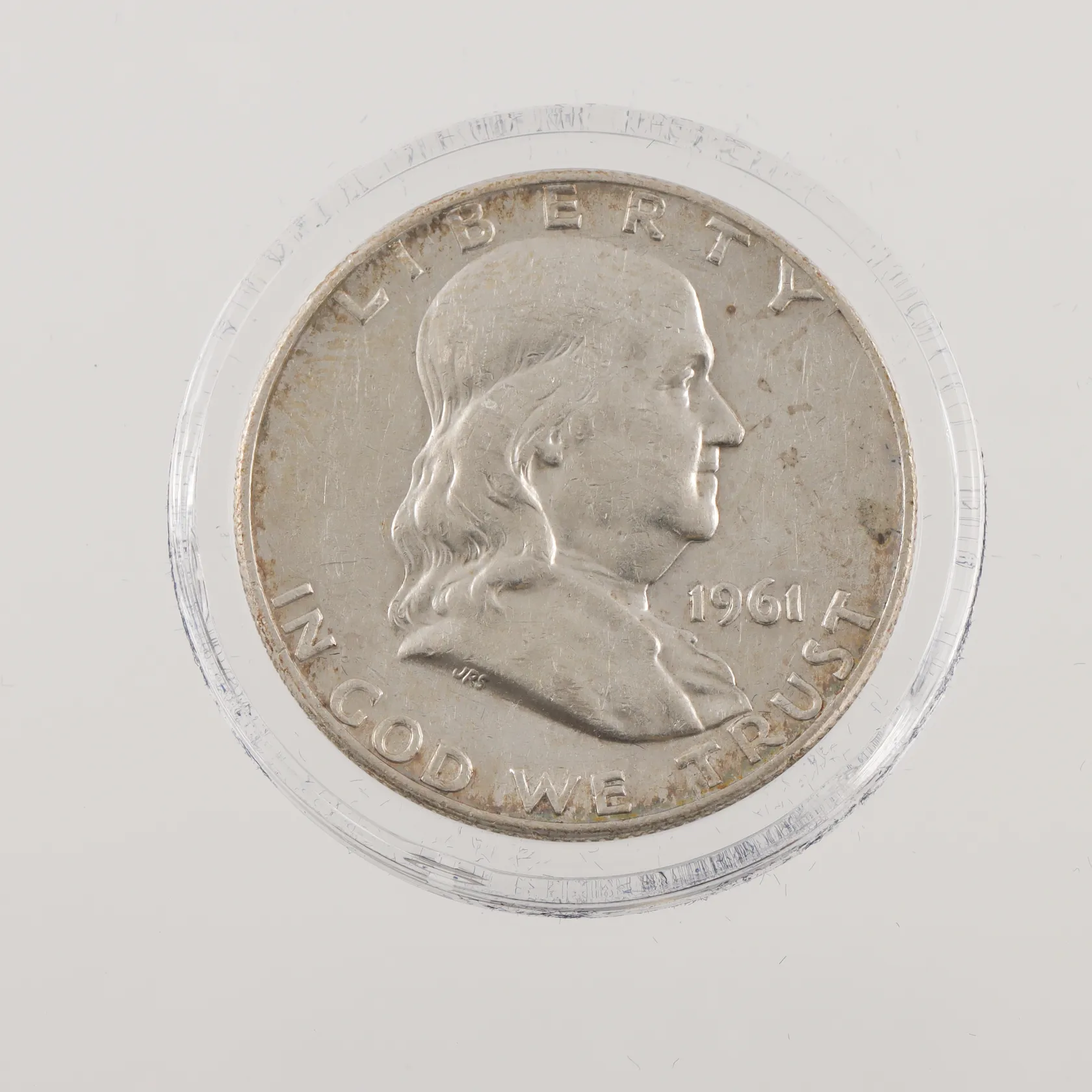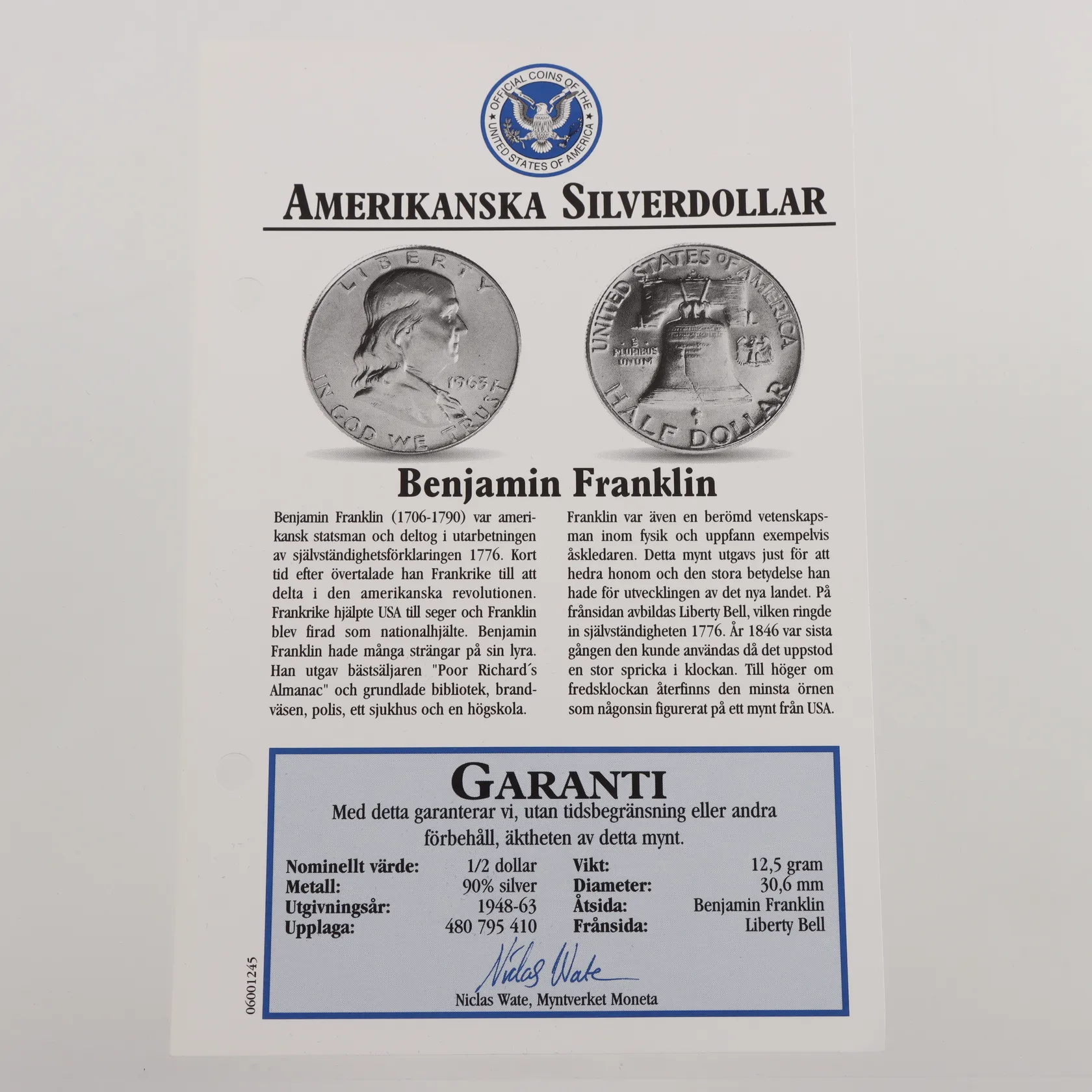 Mynt, Amerikansk silverdollar, ½ Dollar, Benjamin Franklin, Ø30,6mm, 900/1000 silver, plastetui, certifikat från Myntverket Moneta. Vikt: 12,5 g.