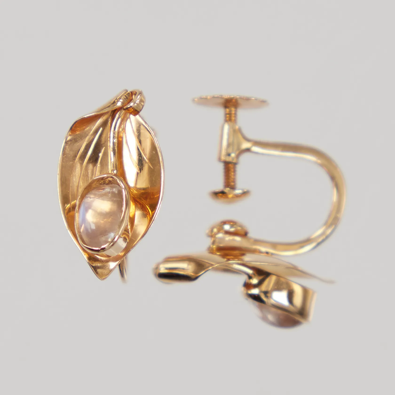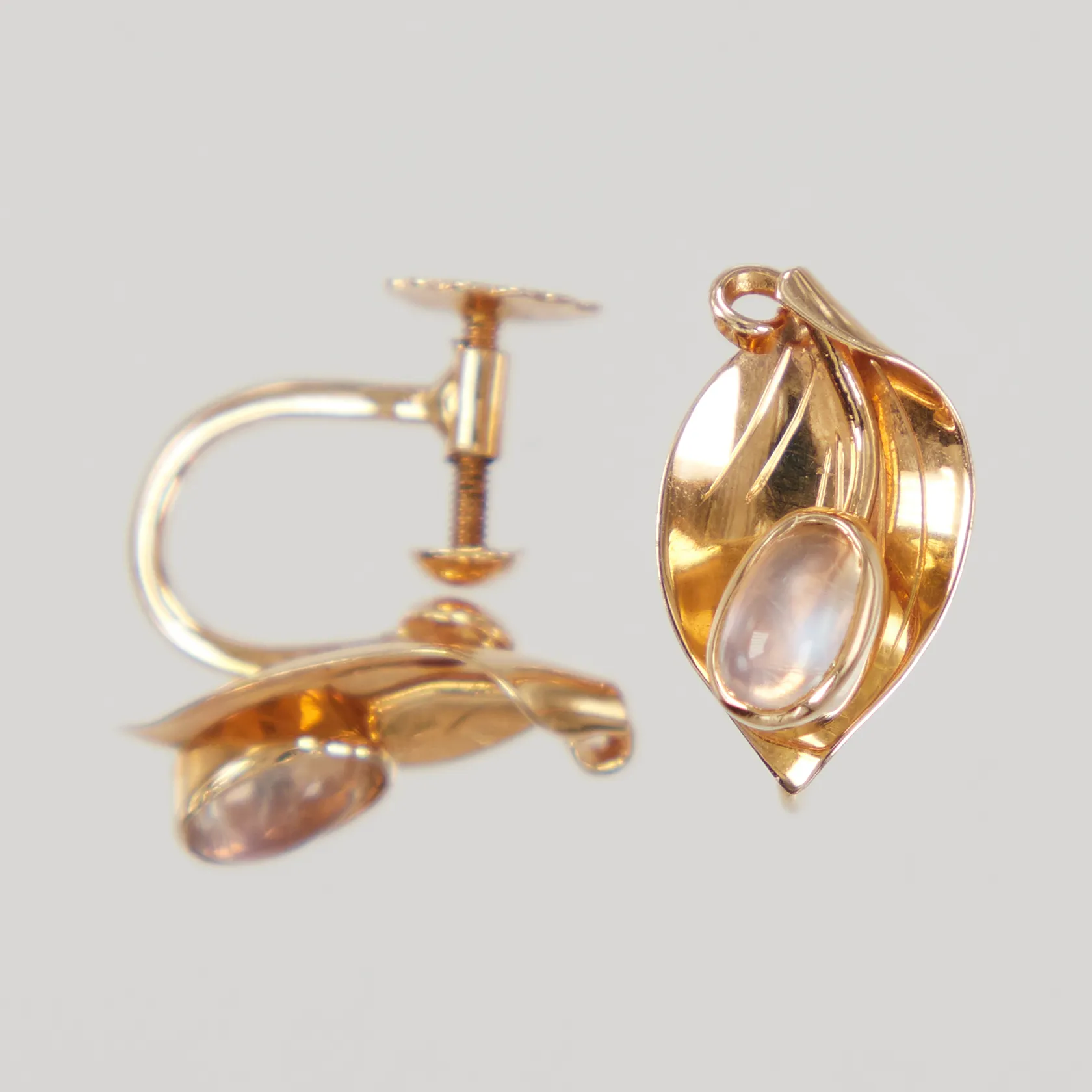 Ett par örhängen blad med vita stenar, 15mm, skruvlås, ena sten med nagg, Fryklund & Pålsson Guldateljen år 1960, 18K Vikt: 2,5 g.
