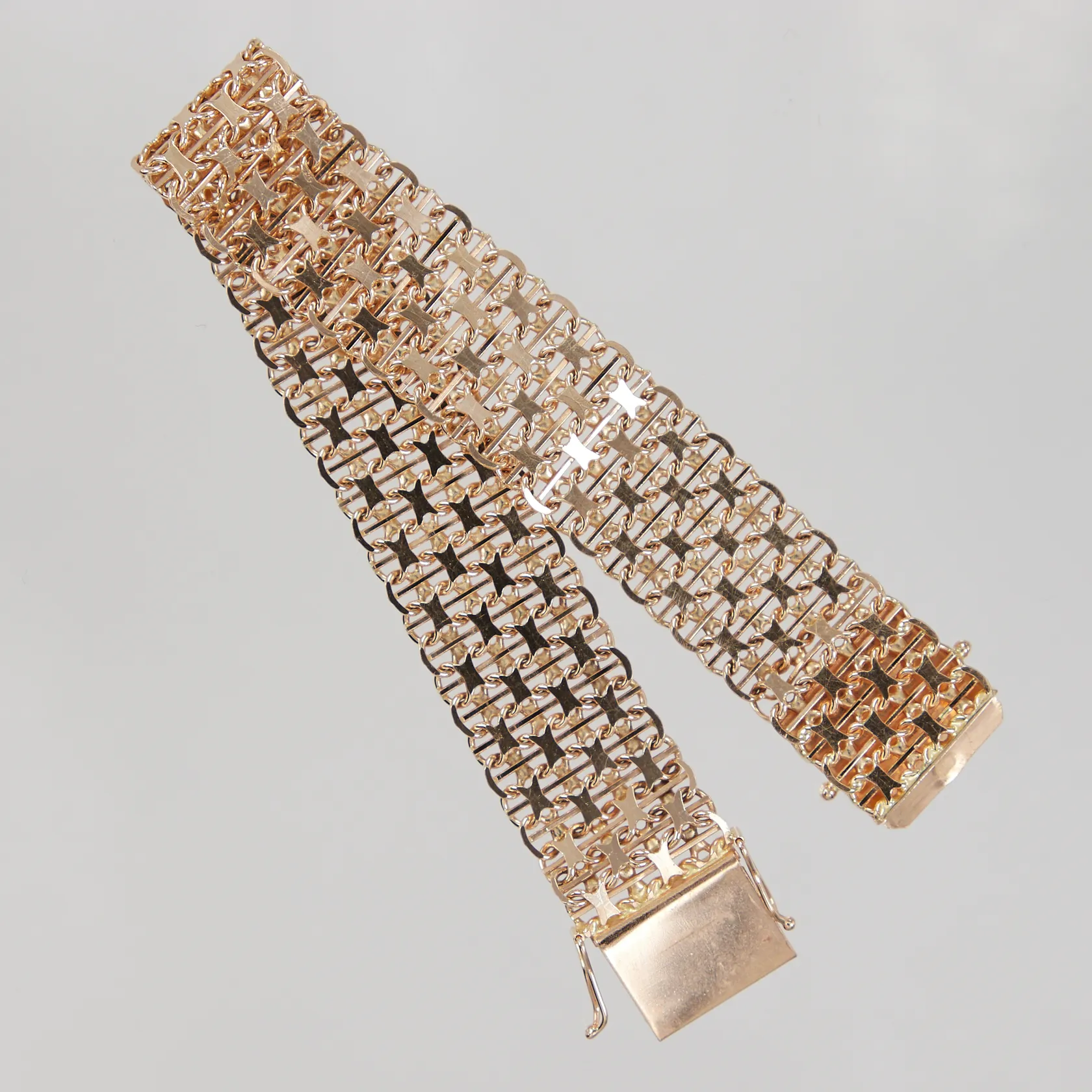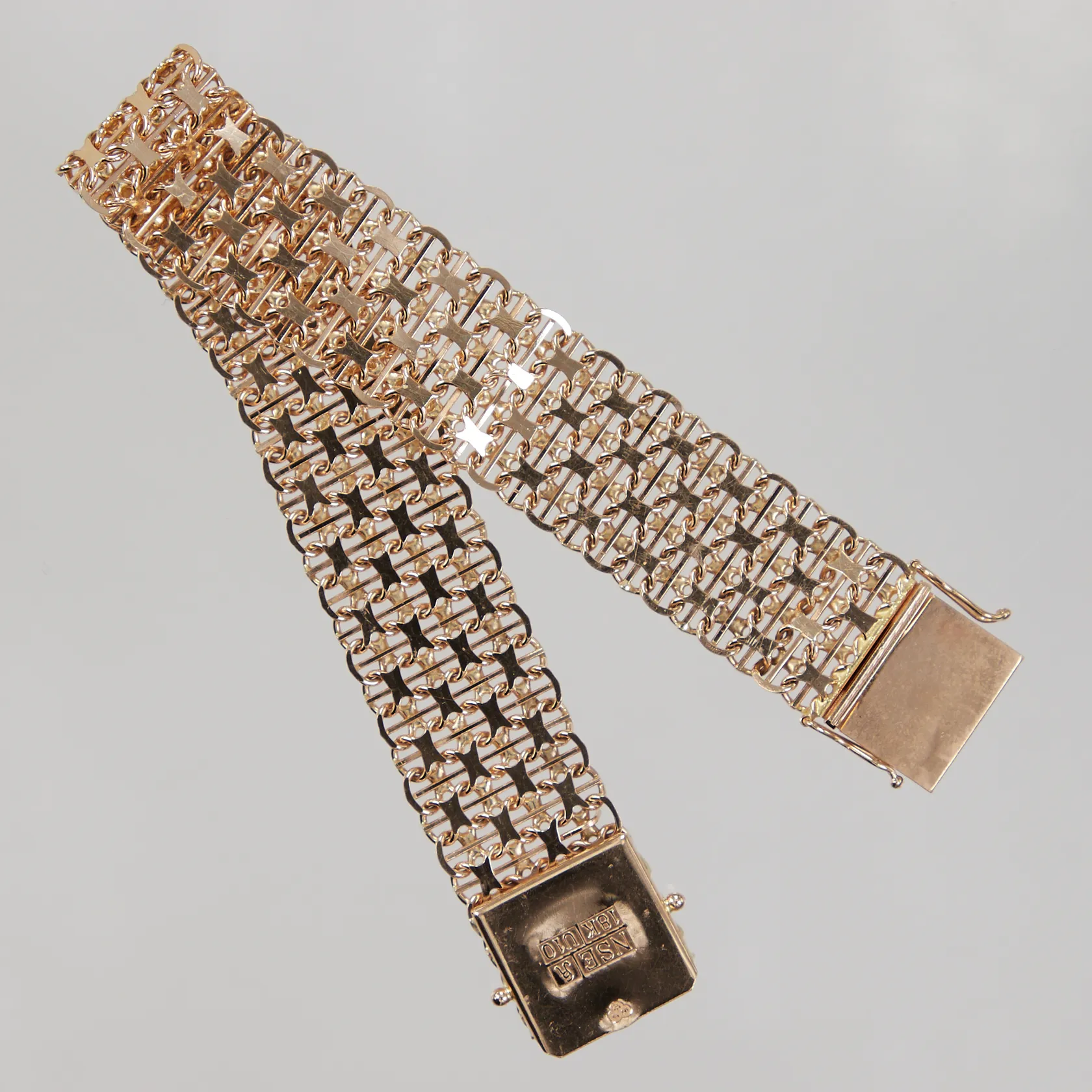 Armband X-länk med stav, längd 19cm, bredd 16mm, en skadad stav, Köping år 1994, 18K Vikt: 30,1 g.