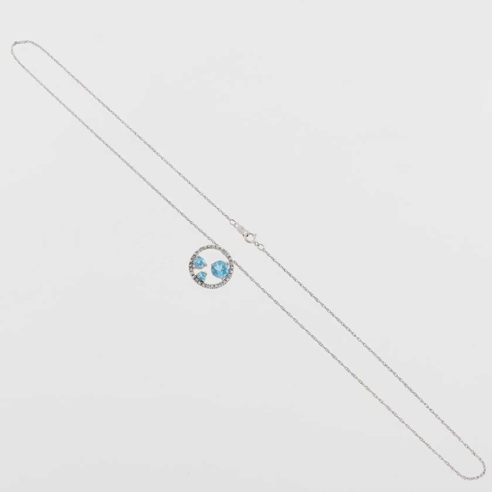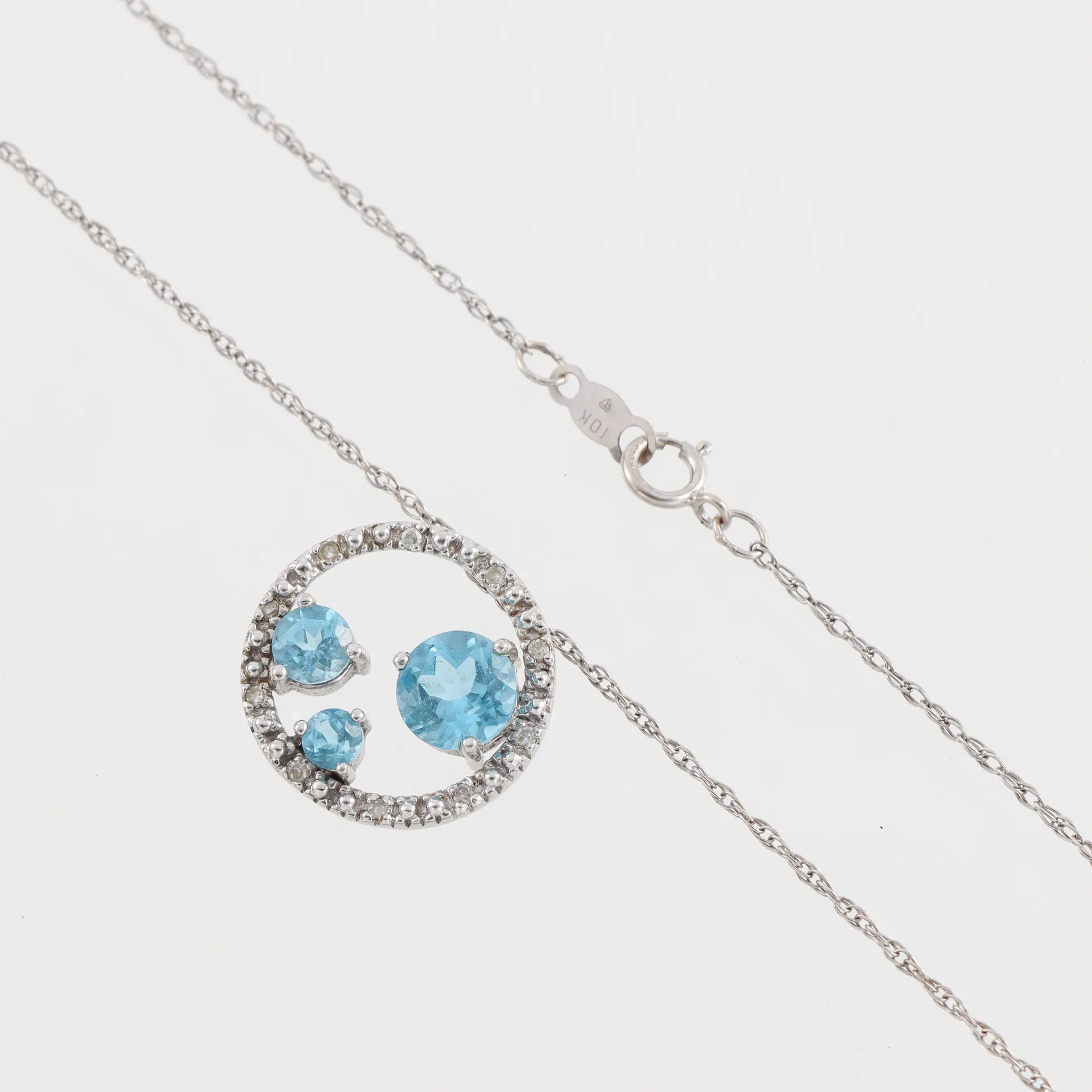 Collier vitguld, hänge med topaser och små diamanter, längd ca 44 cm, hängets diameter ca 15.6 mm, 10k. Vikt: 2,4 g.