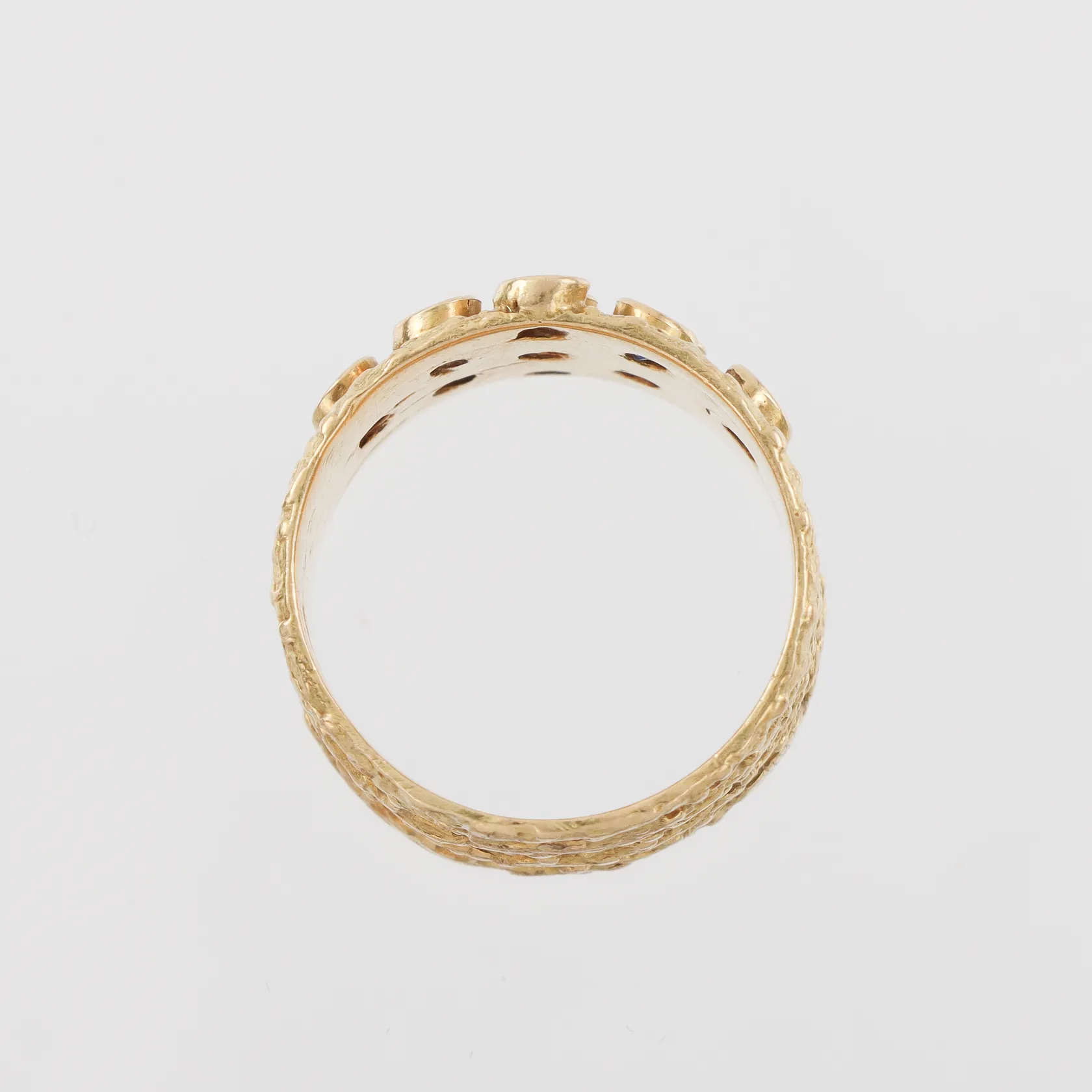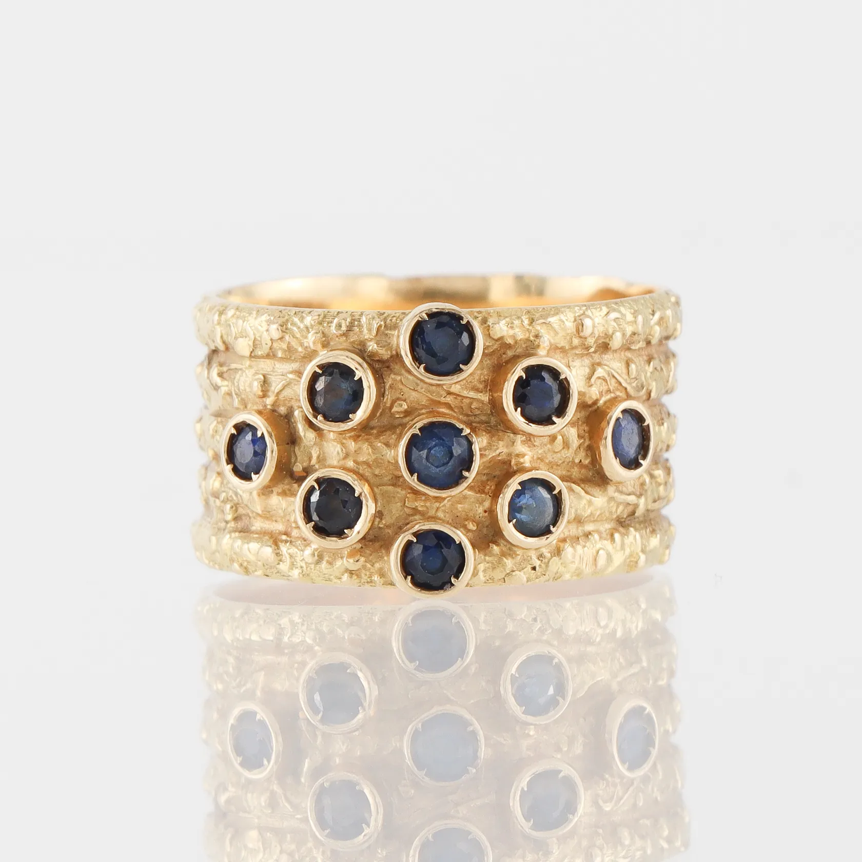 Ring med 9 st små safirer, storlek 16 ½ mm, bredd 10.8 mm,18k. Vikt: 6,9 g.