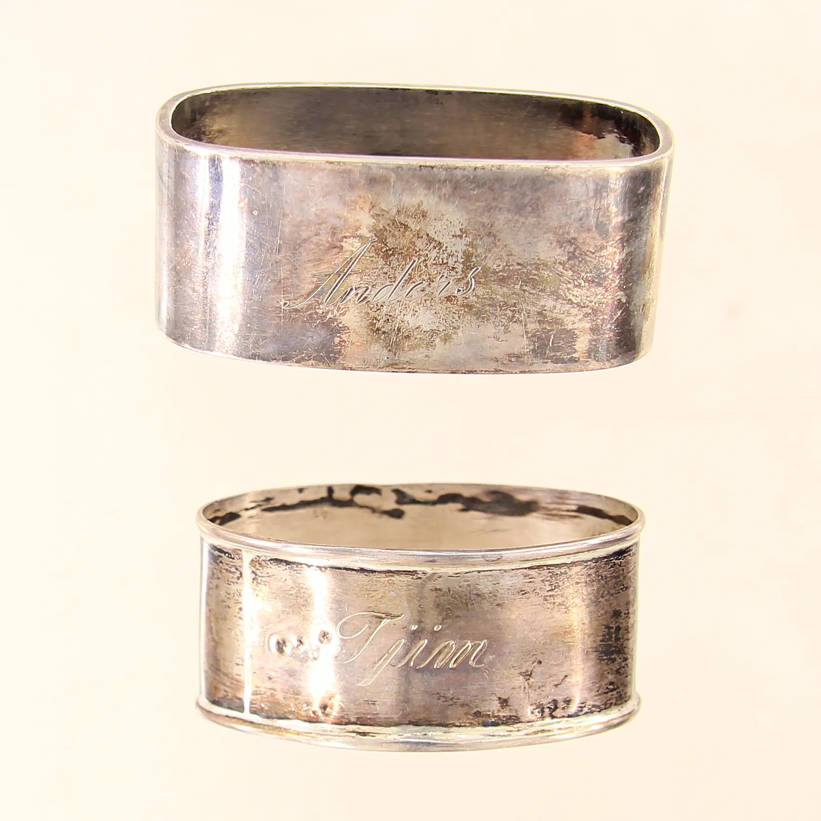 Servettringar, två stycken, bucklor, gravyr, silver 835-925/1000 Vikt: 65,7 g.