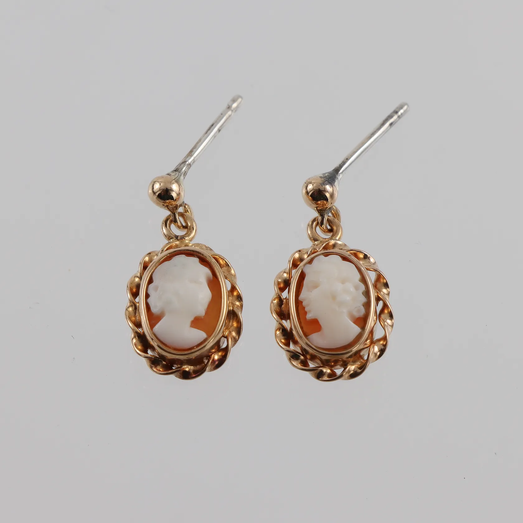 Parörhängen med came, höjd ca 11mm, lås saknas, ramen i 18K, stiften i silver. Vikt: 2 g.