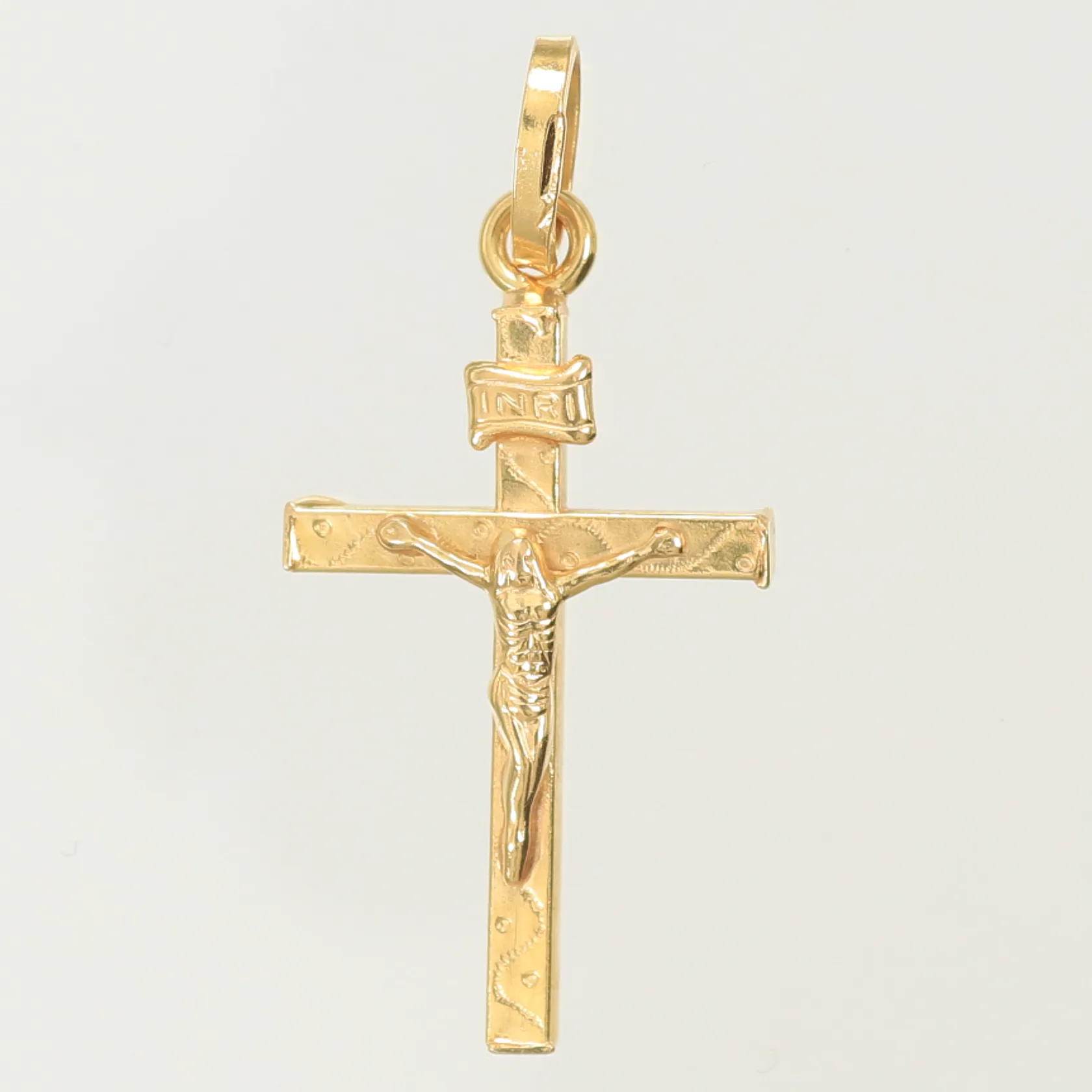 Hänge krucifix, längd 31mm inkl ögla, bredd 2-15mm, 18K, 1,6g Vikt: 1,6 g.