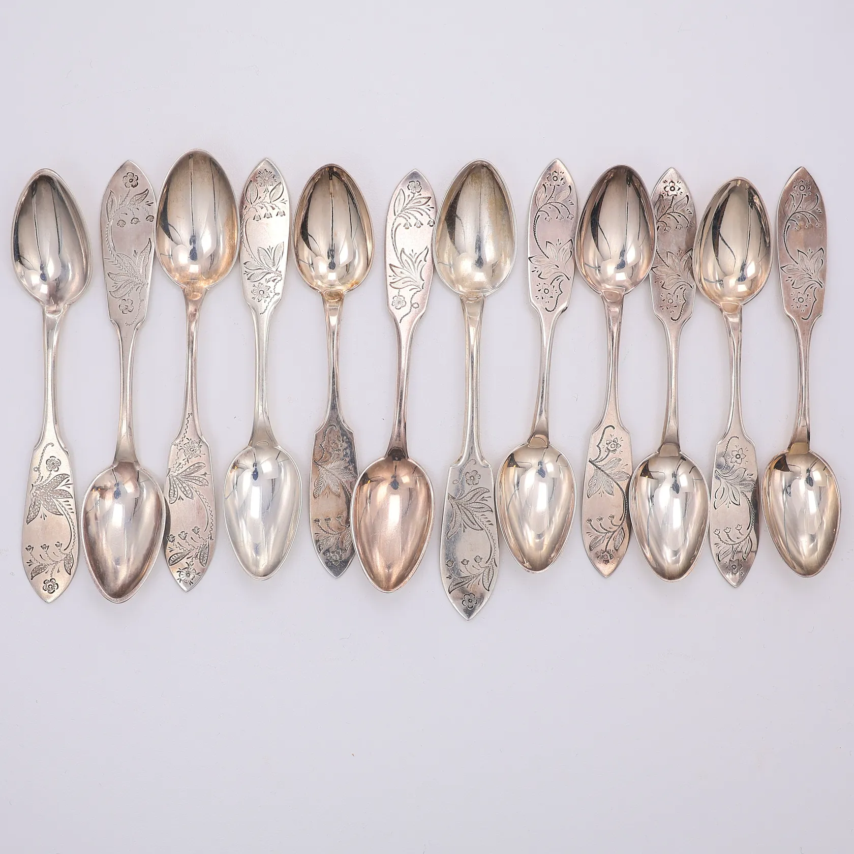 12 Kaffeskedar modell Tornedal 12-13cm, två med gravyr, MEMA & F Olsson, 830/1000 silver Vikt: 166,9 g.