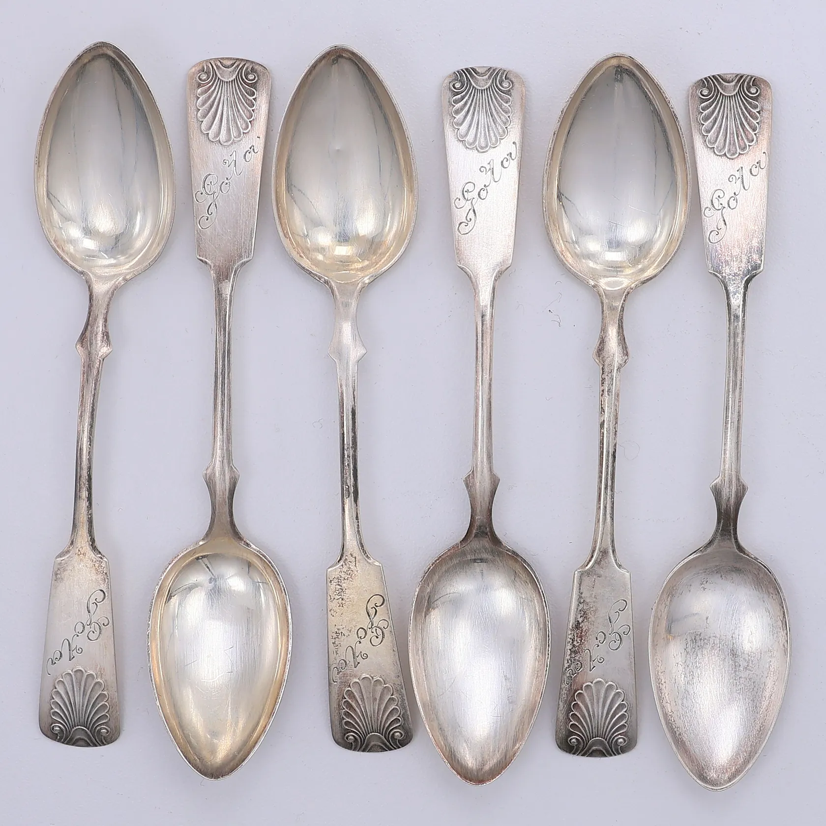 6 Kaffeskedar modell Snäck 12,2cm, Kultakeskus år 1933, gravyr framsida putsmärken, 813/1000 silver Vikt: 56,1 g.
