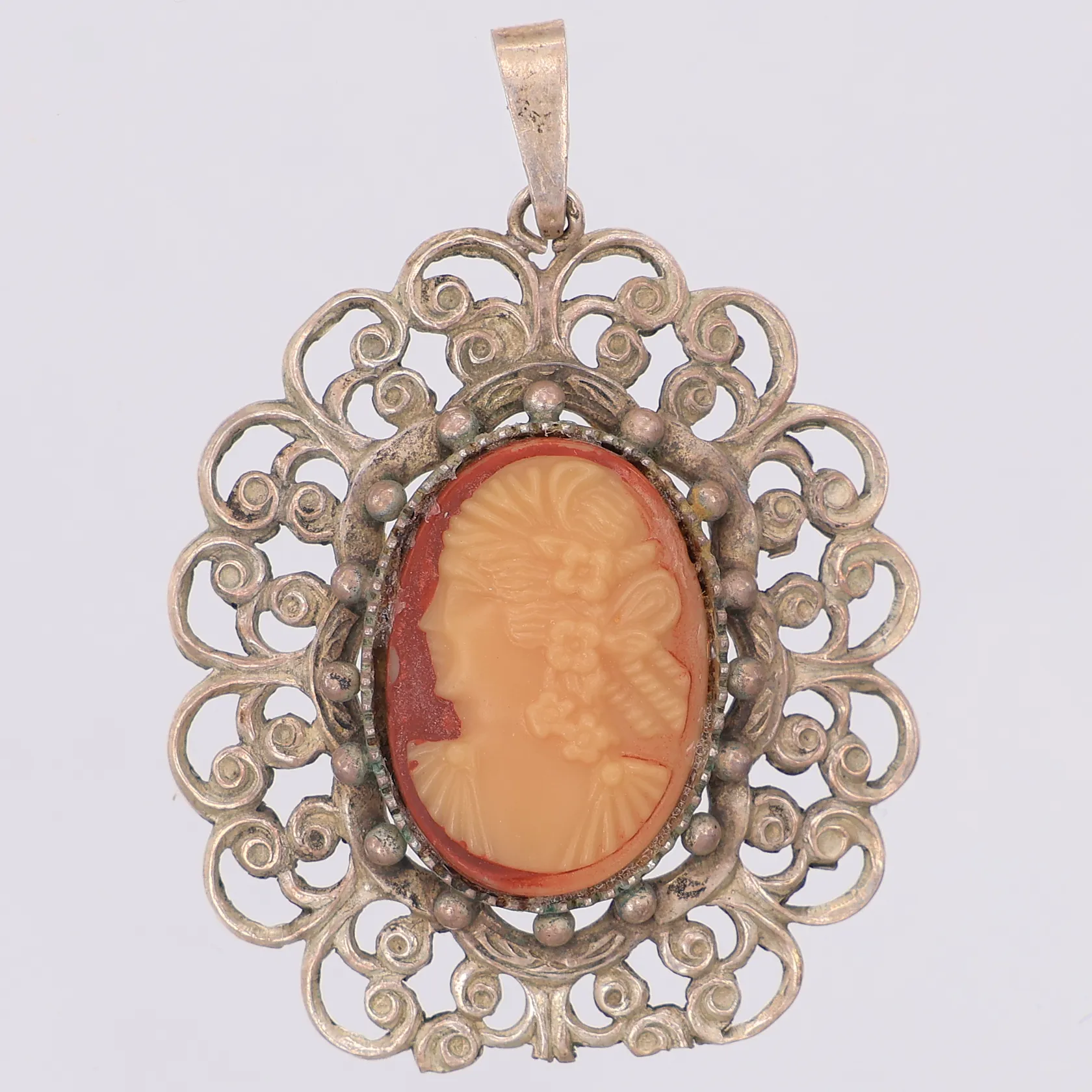 Hänge med camé i plast 42mm, nederdel skadad, 830/1000 silver Vikt: 5 g.