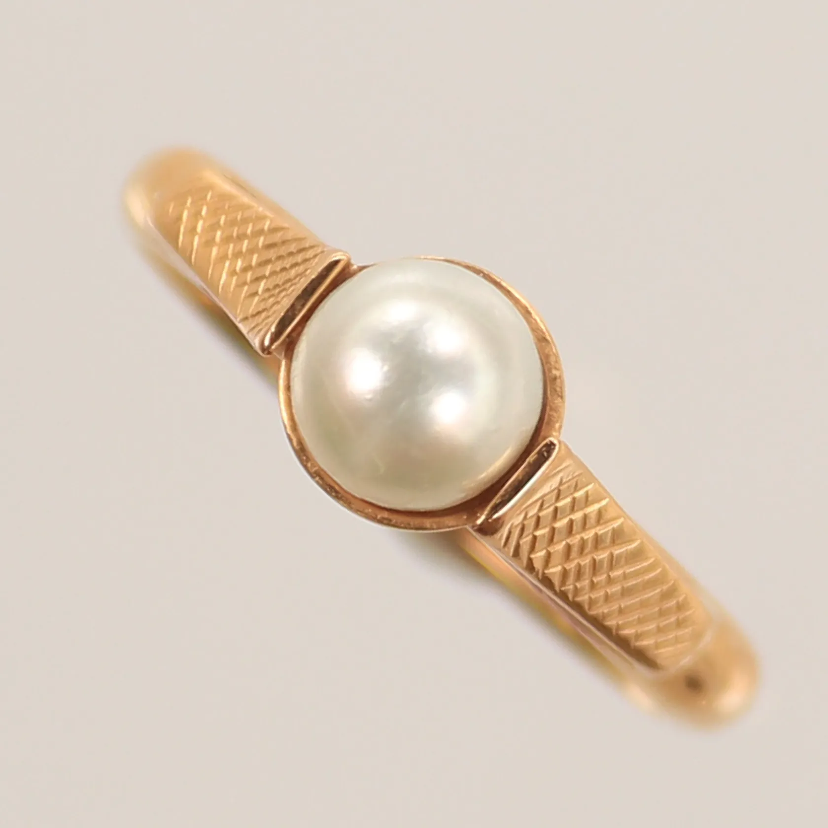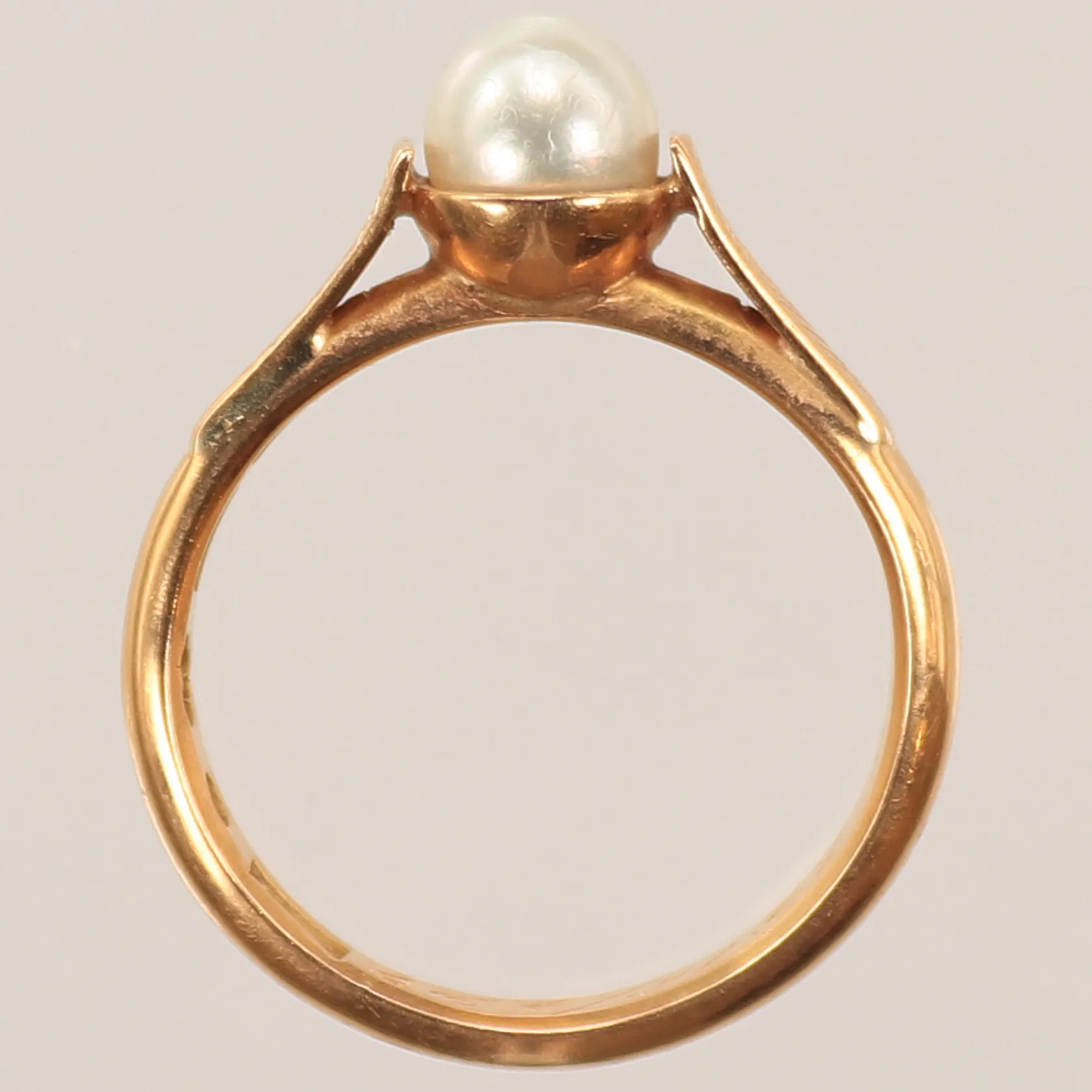 Ring med pärla Ø 6mm, stl 18¾, bredd 3-7mm, graverad skena, 18K 5,7g totalt. Vikt: 5,7 g.