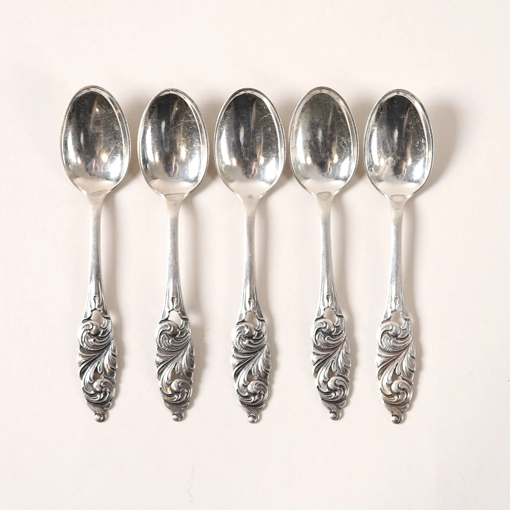 Fem moccaskedar, norska stämplar, svenska importstämplar, längd 10cm, slitage, 830/1000 silver. Vikt: 41,7 g.
