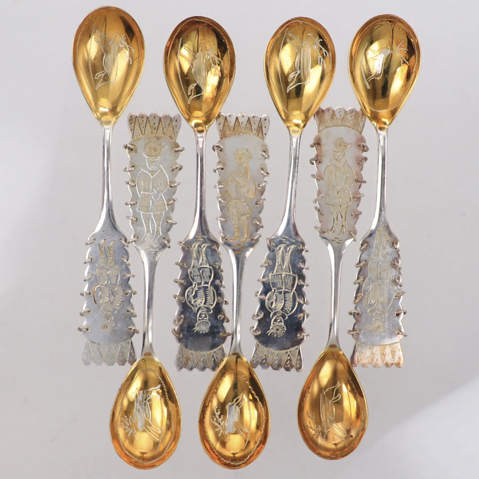 7 mockaskedar samiskt motiv, längd 11cm, förgyllda blad, FIN, 830/1000 silver Vikt: 65,6 g.