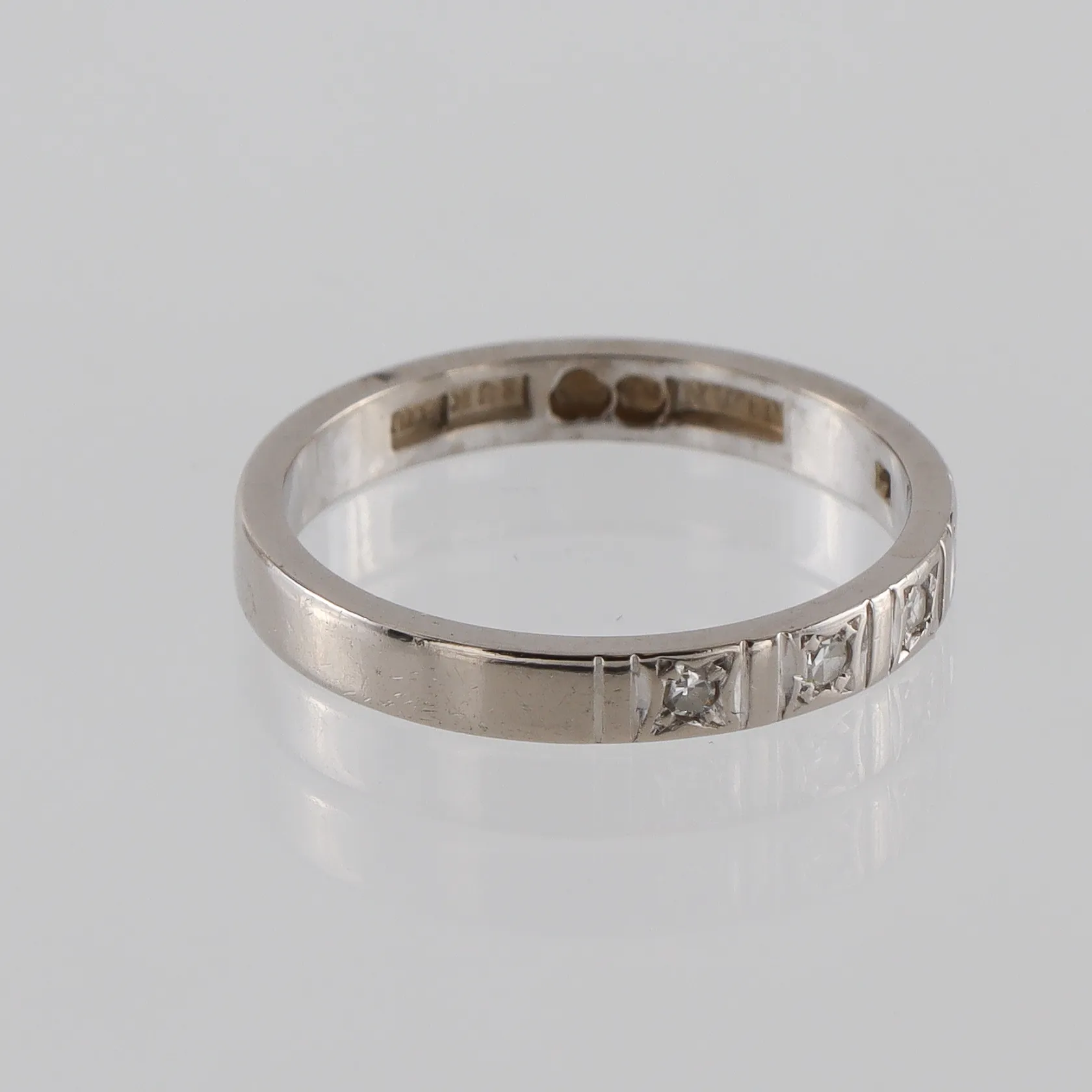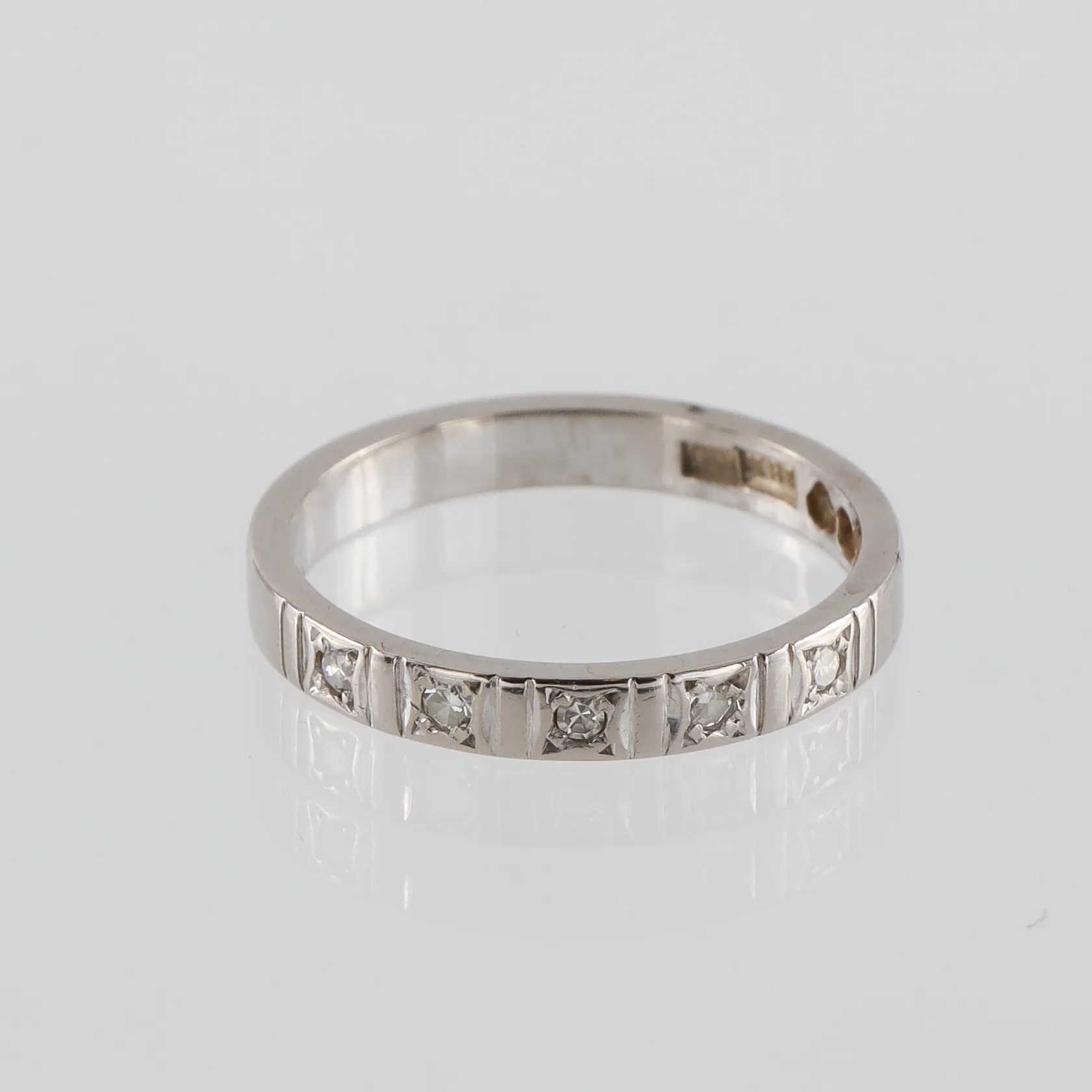 Ring med diamanter ca 5x0,01ct, stl 17mm, bredd 2,7mm, vitguld, 18K. Vikt: 3,1 g.