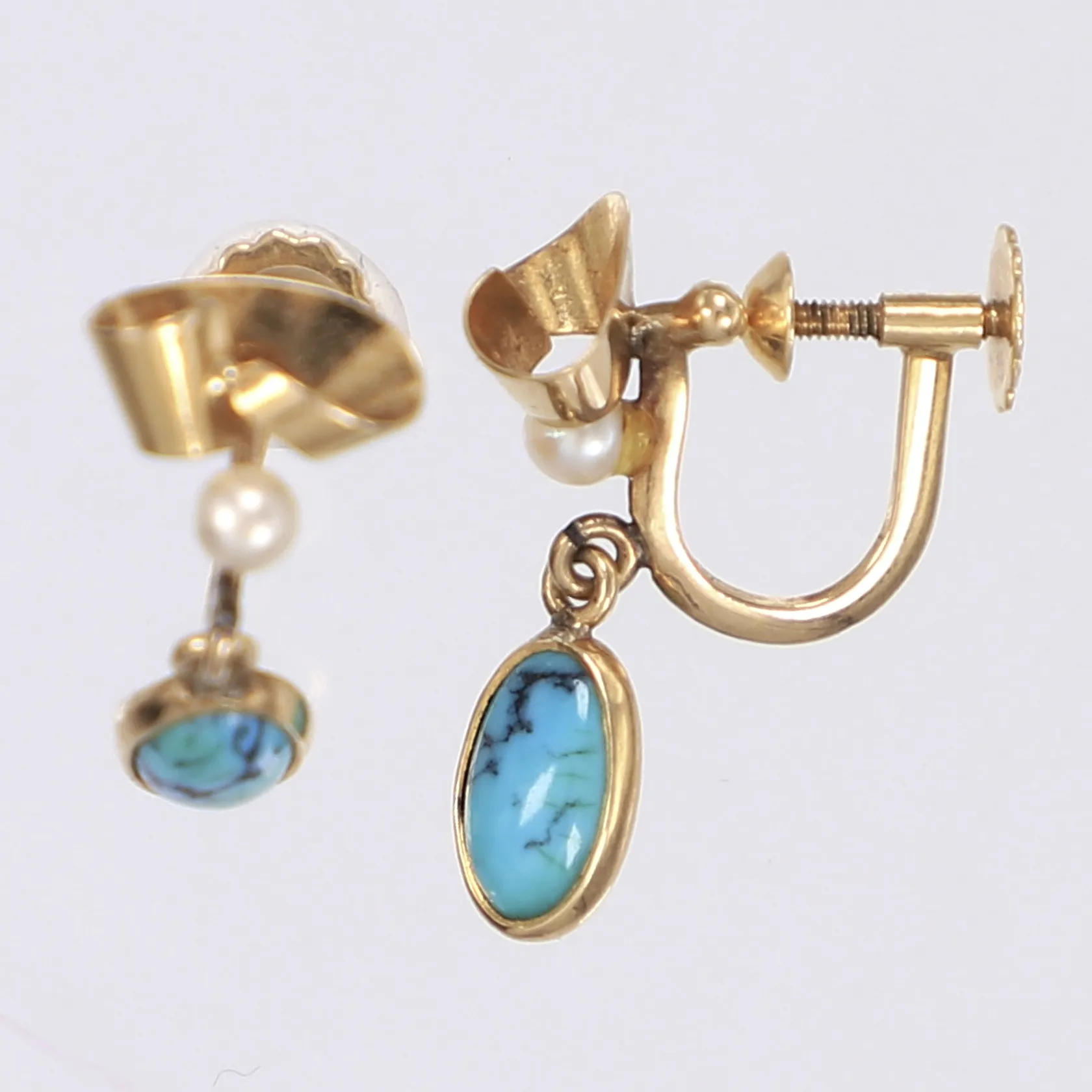 Ett par örhängen med troligen turkos och pärlor höjd ca 20mm svenska stämplar 1963 18K Vikt: 2,3 g.