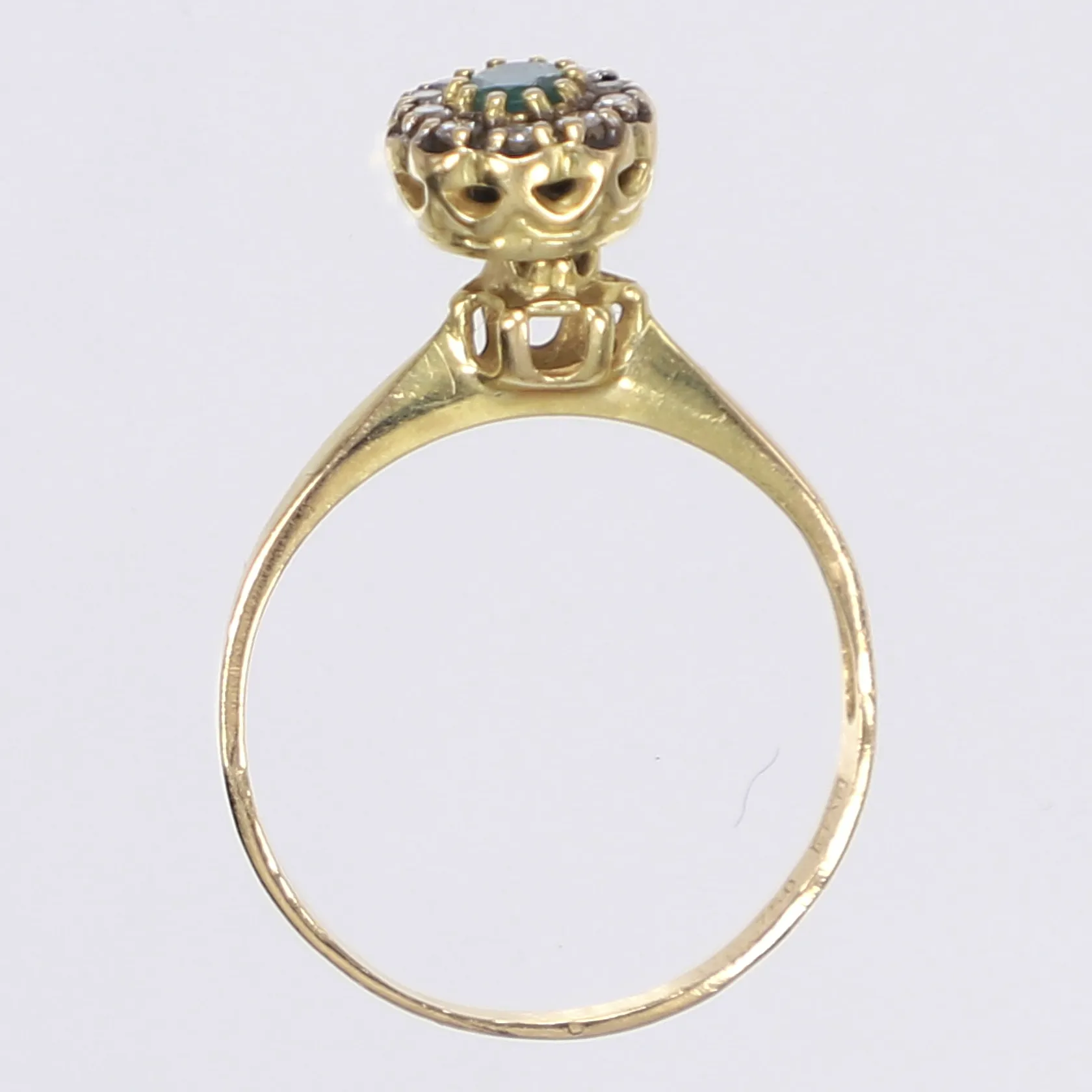 Ring med diamanter 10xca0,01ct och grön sten troligen smaragd stl 17¼ bredd 1-8mm Guldfynd sliten skena 18K Vikt: 2,9 g.