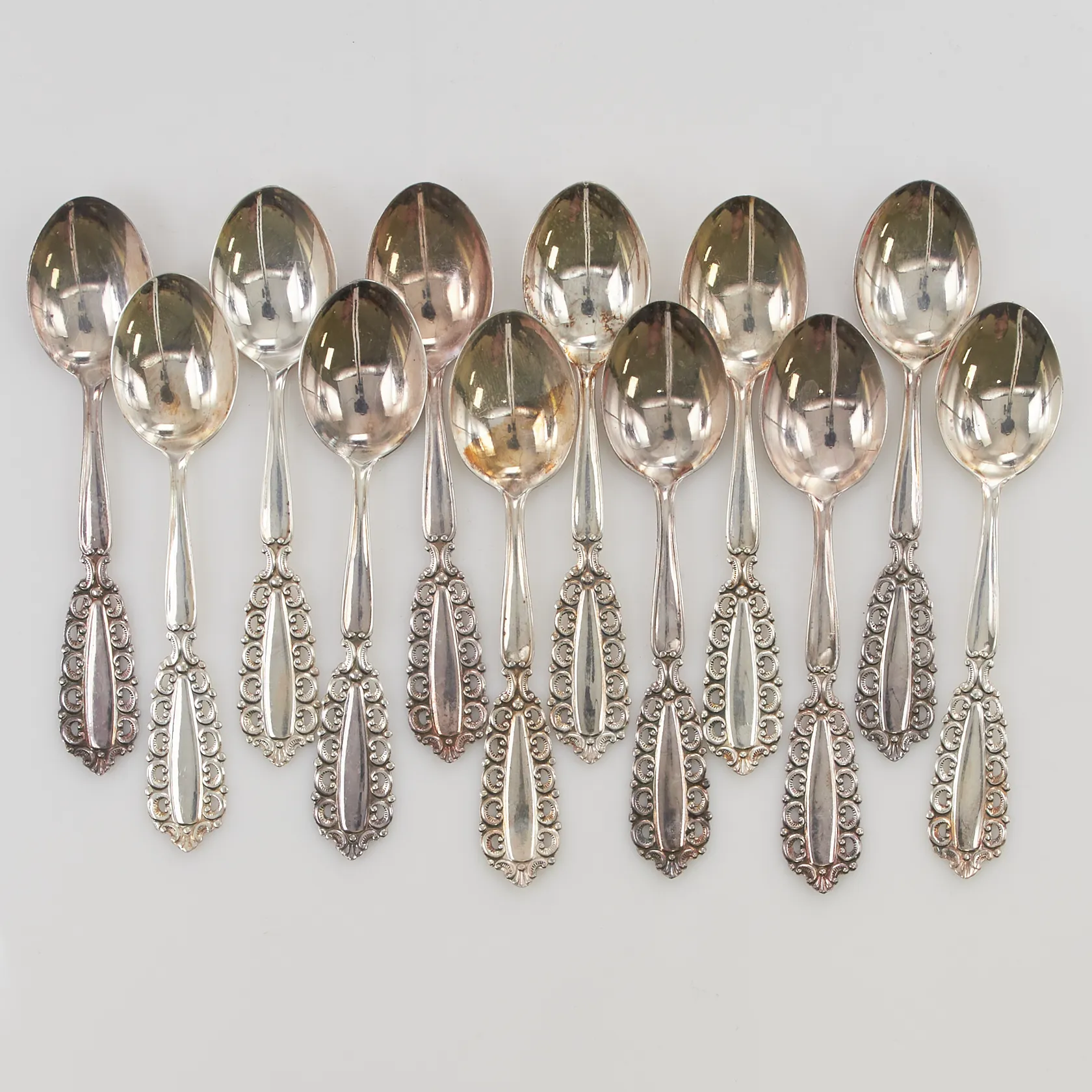 12 Moccaskedar, 10cm, tillhörande schatull, 830/1000 silver, 100,6g. Vikt: 100,6 g.