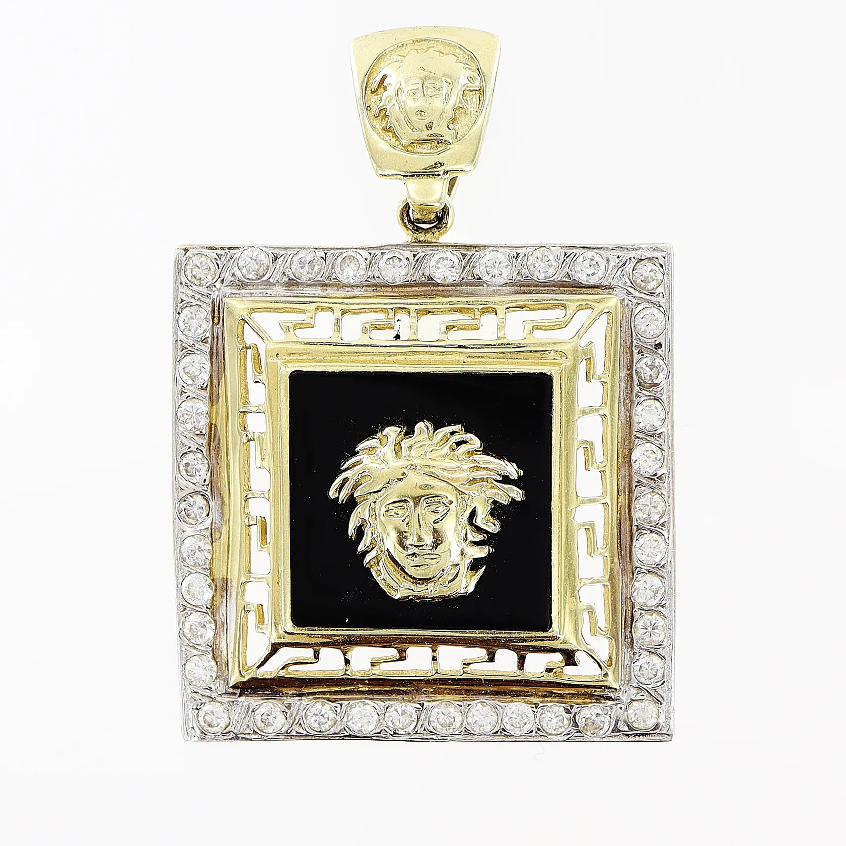 Hänge medusa 48x33mm, onyx samt vita stenar, 14K Vikt: 15,9 g.