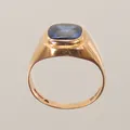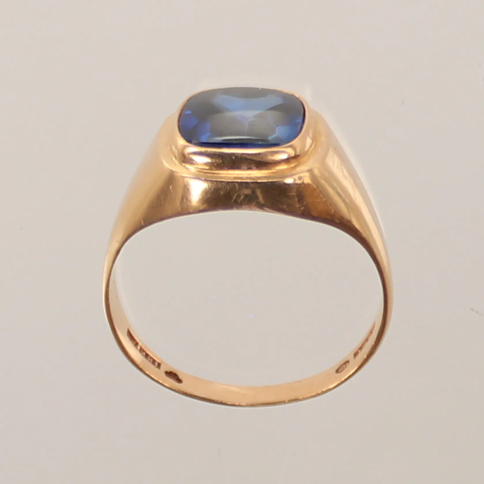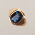 Klackring med blå sten, stl 19¼, bredd 3-15mm, ojämn skena, 18K 4,9g totalt Vikt: 4,9 g.