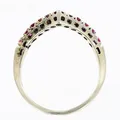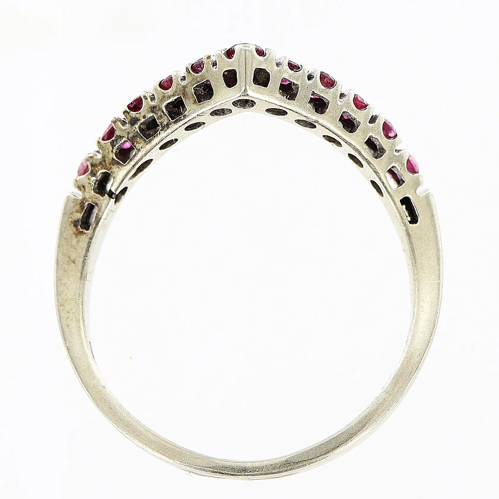 Ring med rubiner, V-formad skena, bredd 1,5-2mm, stl 15¾, vitguld, i behov av rodiering, mindre nagg i rubiner, 18K Vikt: 2 g.