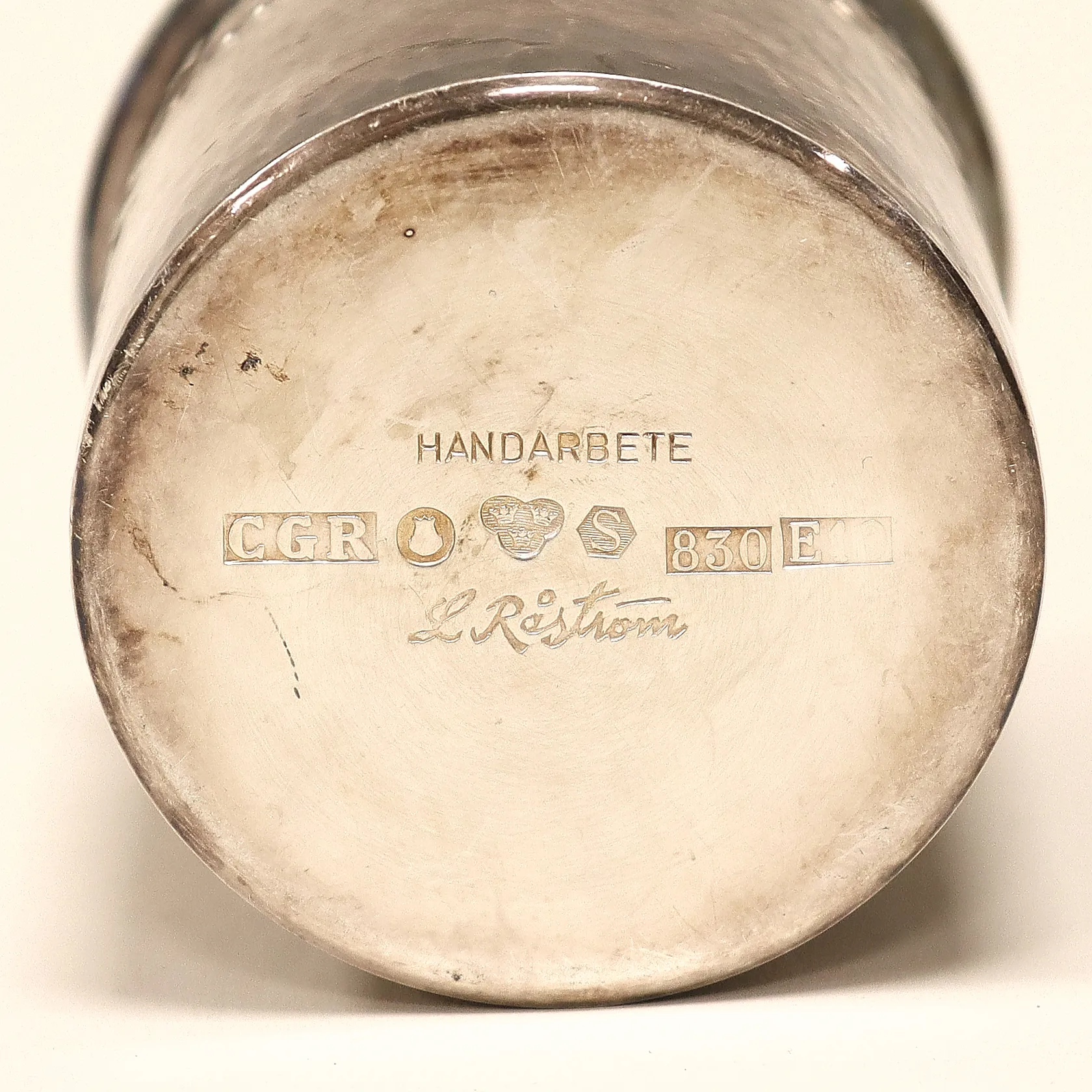 Bägare L Råström, handarbete, höjd 60mm, Ø60mm, hamrad yta, silver 830/1000. Vikt: 109,8 g.