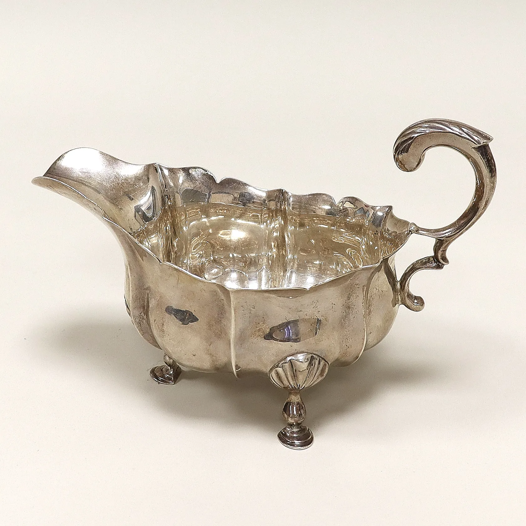 Såssnipa England, höjd 110mm inklusive hänkel, bredd 170x90mm, repor, silver. Vikt: 245,4 g.