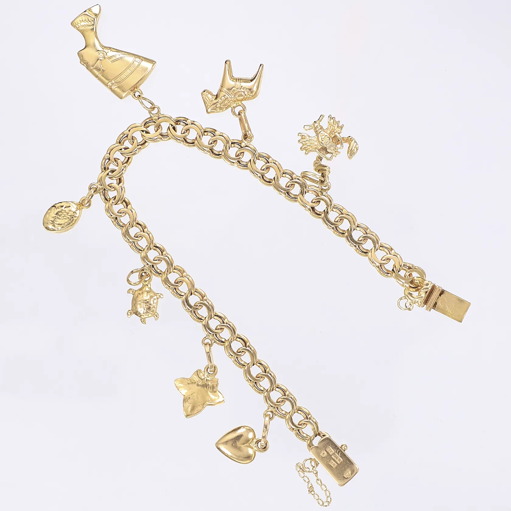 Armband Bismarck med sju berlocker 19cm bredd 6mm saknar säkerhetsåttor samt defekt säkerhetskedja 18K Vikt: 18,7 g.