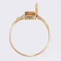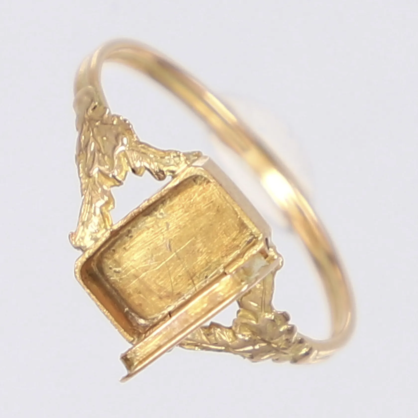 Ring med gömma stl 19 bredd 1-9mm, gömman stämplad CWD (?) kattfot och 18K sannolikt 1800-tal med senare skena slitage 18K Vikt: 1,8 g.