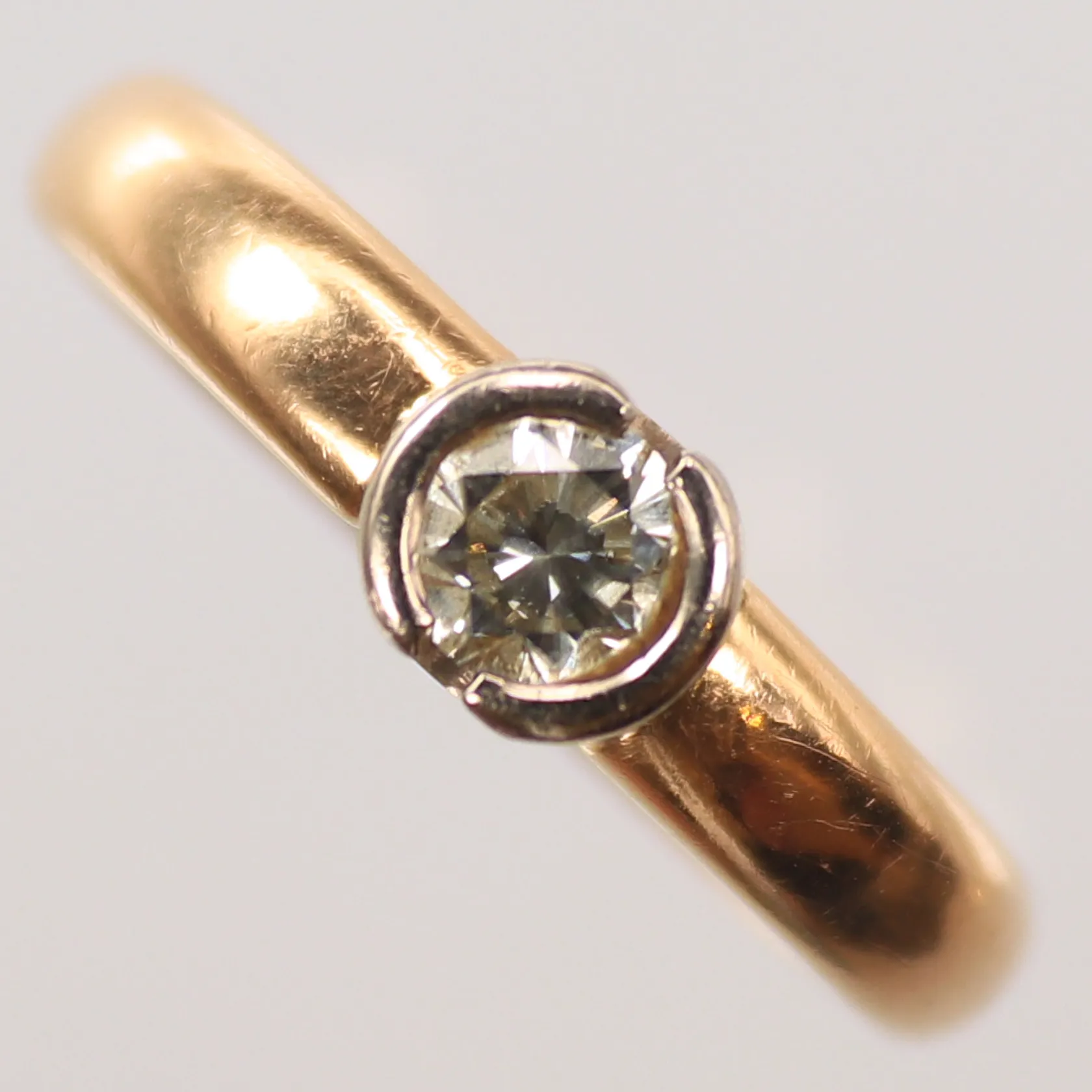 Ring med diamant, 0,46 ct enl gravyr, stl 18¼, bredd 3-5mm, 18K Vikt: 9,2 g.