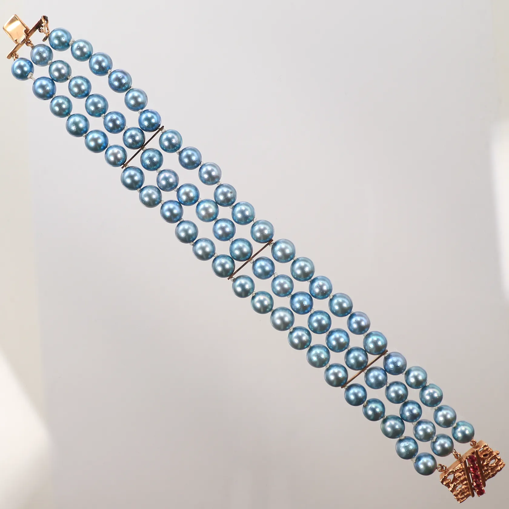Armband 3-radigt med blå pärlor (Ø7mm) och guldlås 14K med röda stenar. Längd 20cm bredd 20mm, 14K bruttovikt 41,1g Vikt: 41,1 g.