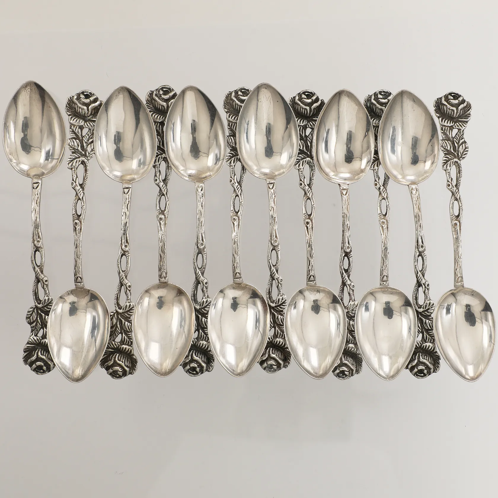 Tolv moccaskedar, floral dekor, längd 10cm, silver 835/1000 Vikt: 102,2 g.