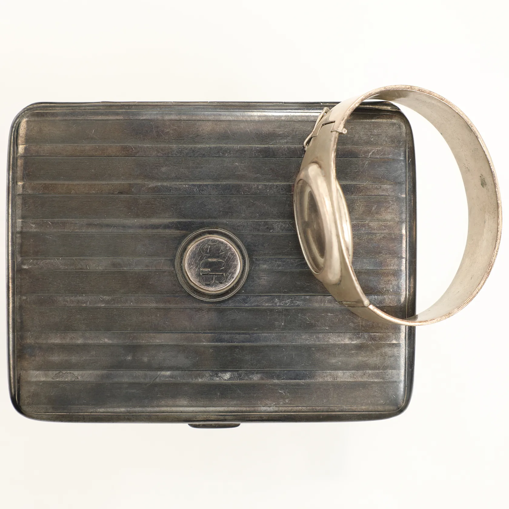 Diverse silver, defekt, gravyr, silver Vikt: 232,7 g.