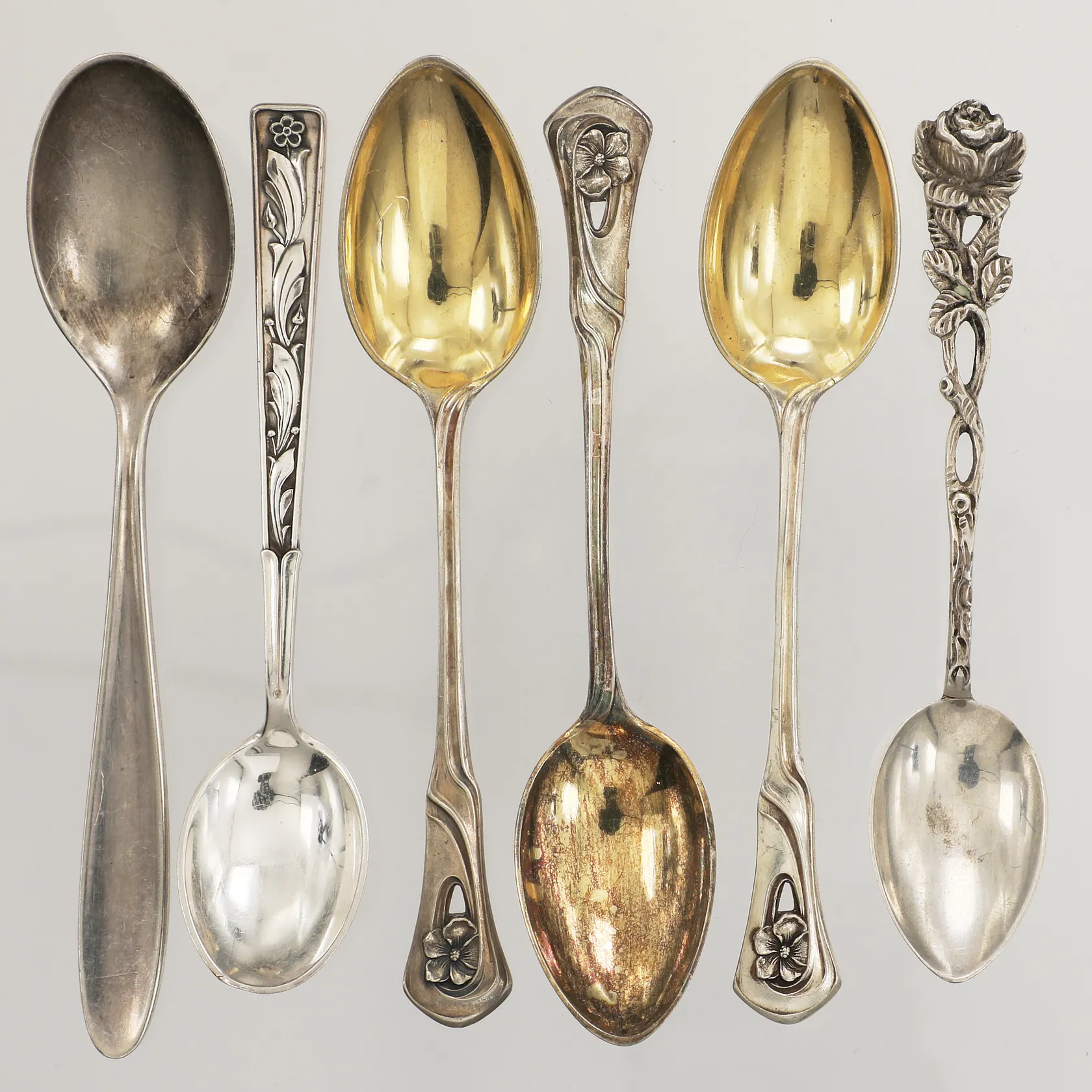Sex kaffeskedar, längd 10-11cm, olika modeller, förgyllda, 830/1000 silver Vikt: 67,1 g.