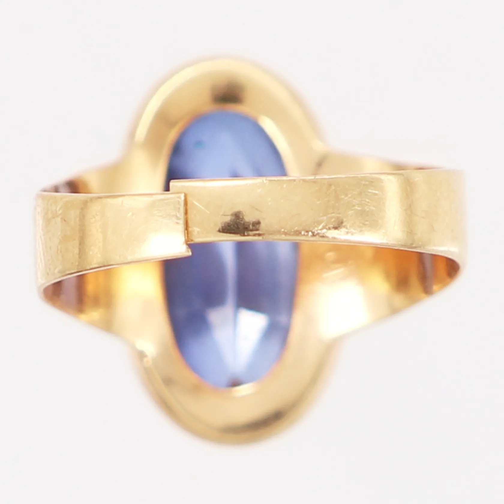 Ring med blå sten, klippt skena, stl ca 16 bredd: 3-16mm, 18K Vikt: 3,3 g.