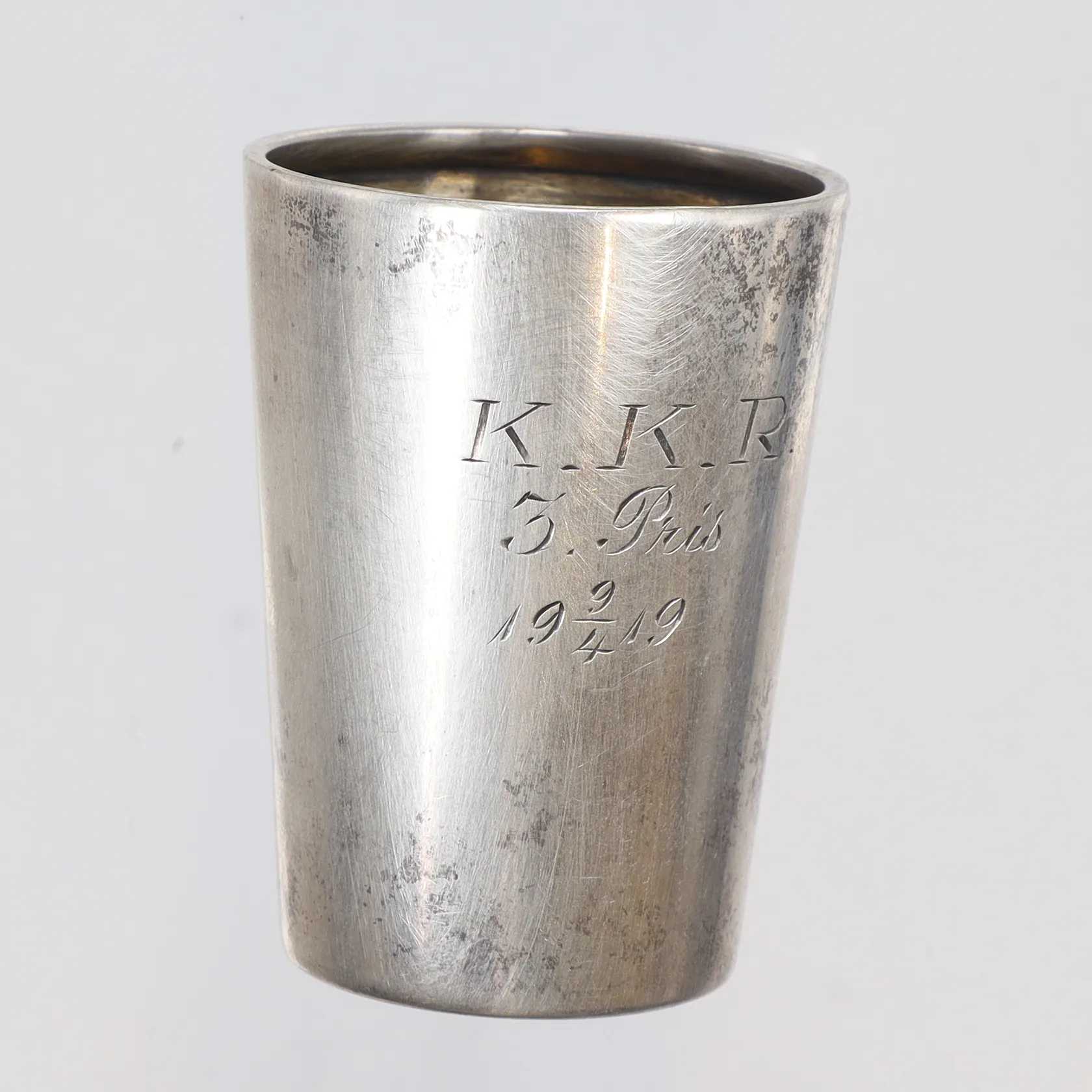 Miniatyrbägare höjd 42mm, gravyr CG Hallberg Stockholm 1918 silver 830/1000 Vikt: 18,6 g.