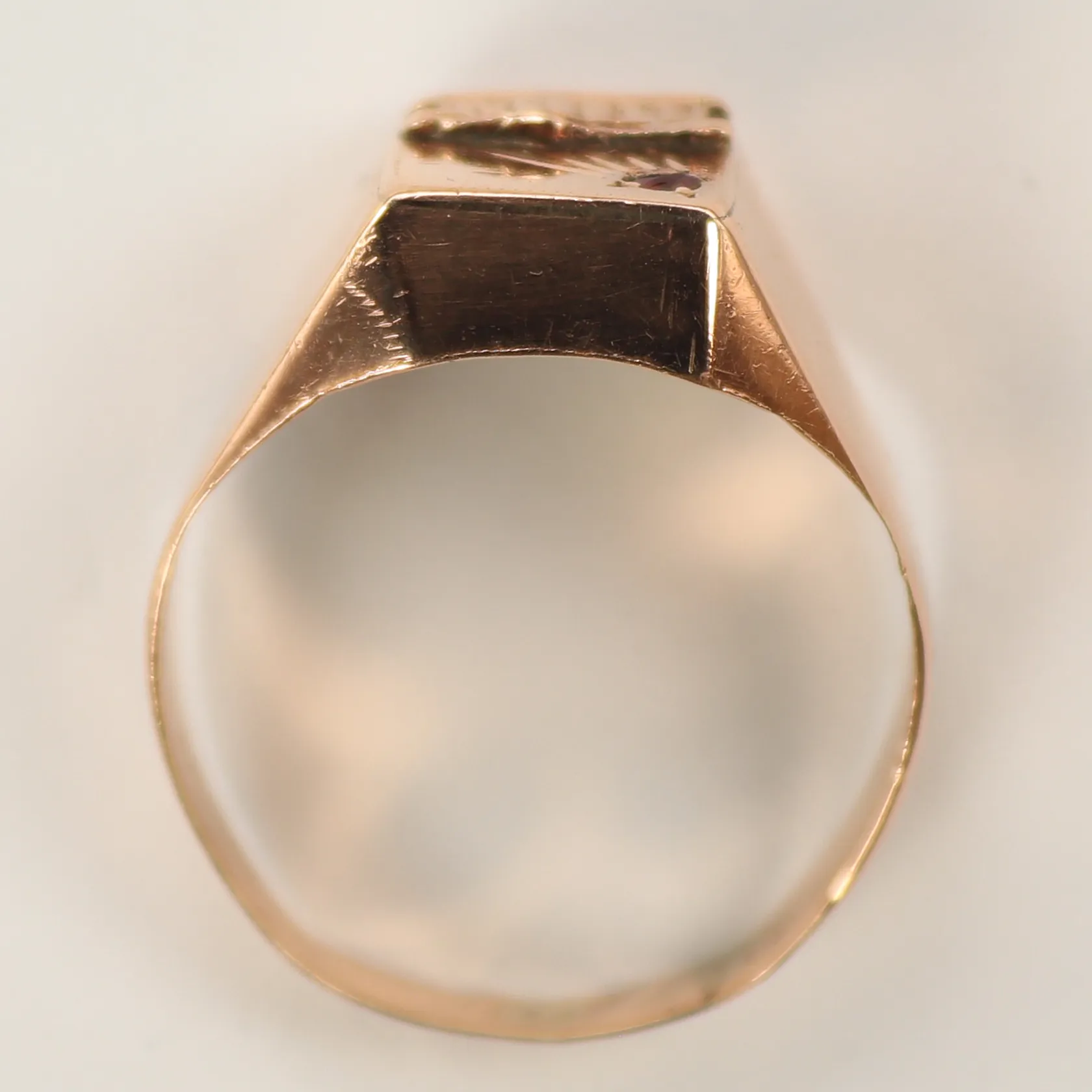 Klackring med röd sten, stl 20, bredd 3-12mm, sliten/ något skev skena, 14K Vikt: 6,4 g.