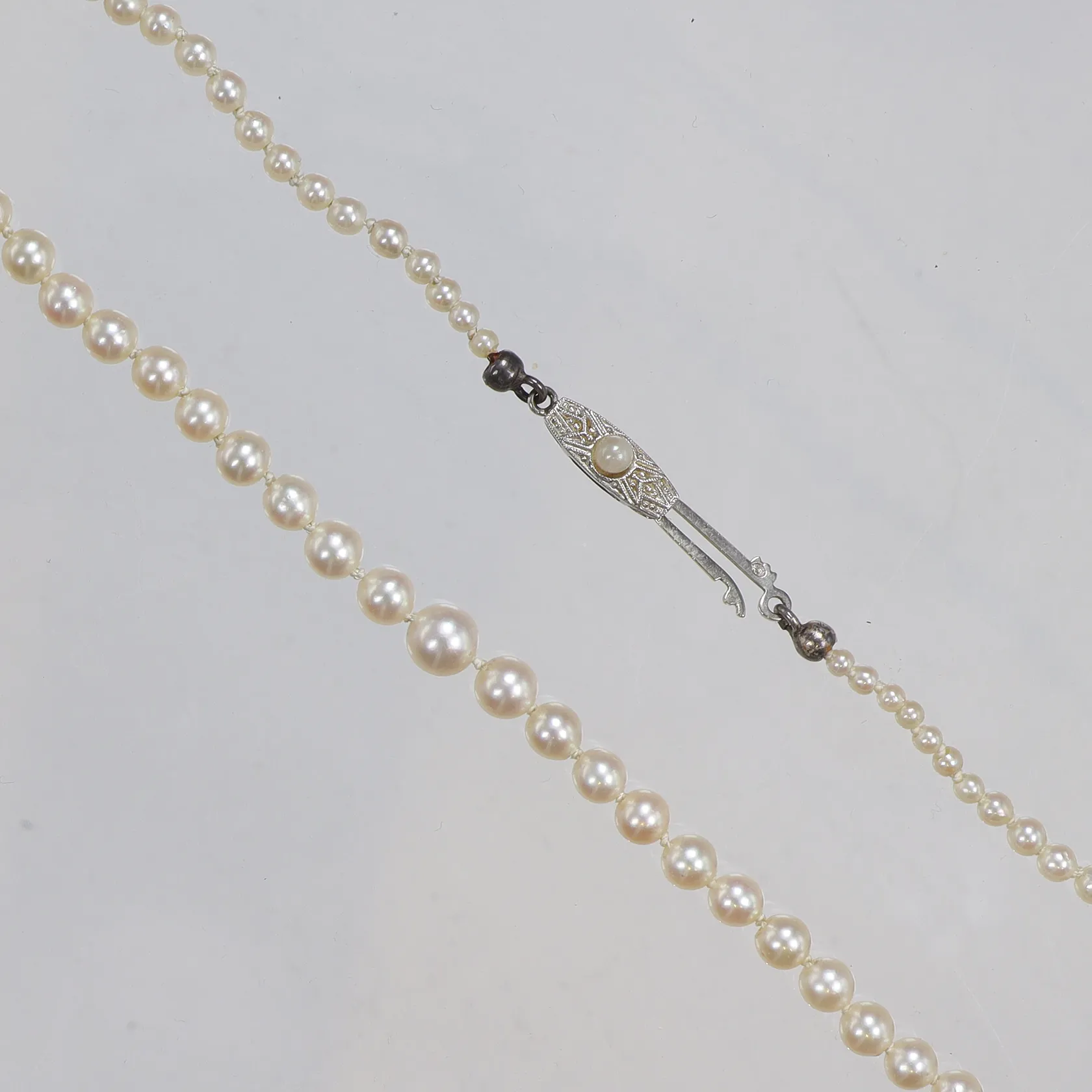 Pärlcollier med odlade pärlor, troligen saltvattenpärlor, längd 48cm, bredd 1,2-5mm visst slitage lås i 18K, bruttovikt 7,7g Vikt: 7,7 g.