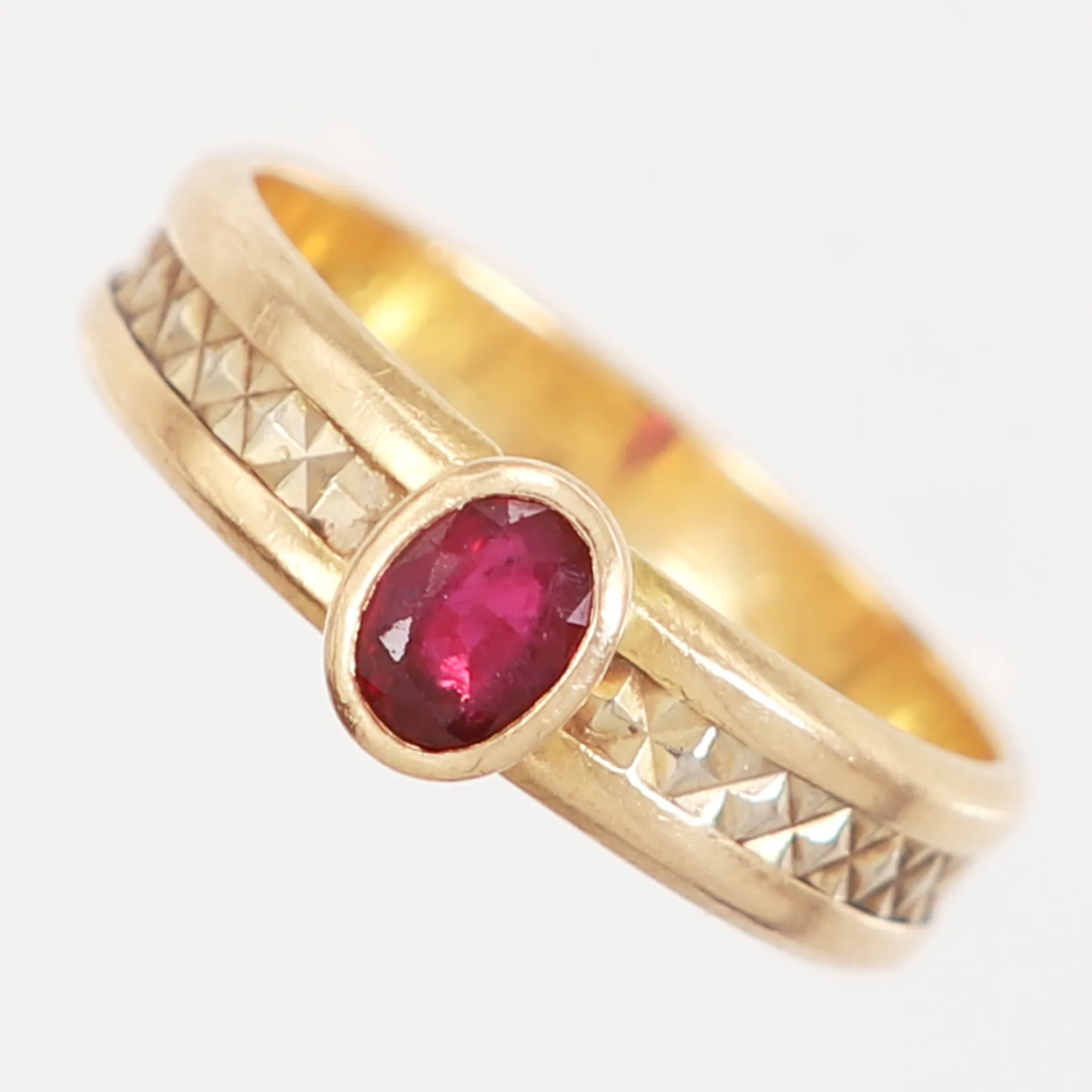 Ring med rubin stl 18½, bredd: 5-7mm, gravyr, repor på sten, 18K Vikt: 4,6 g.